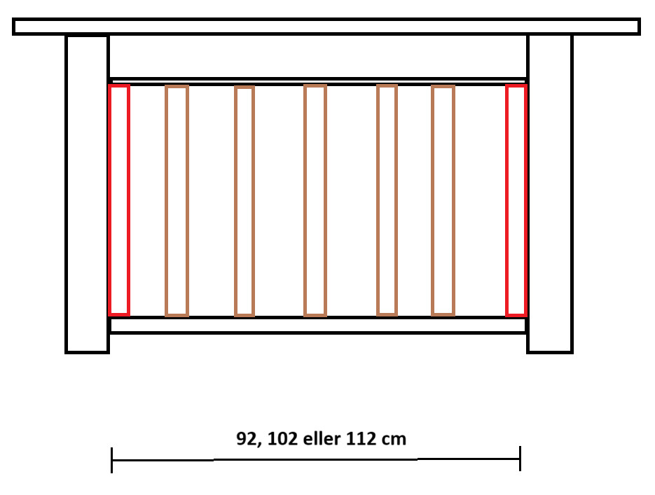 Bygger ett räcke på altanen ungefär enligt bild. De röda spjälorna vill jag ha direkt mot stolpen. De bruna är anpassningsbara.