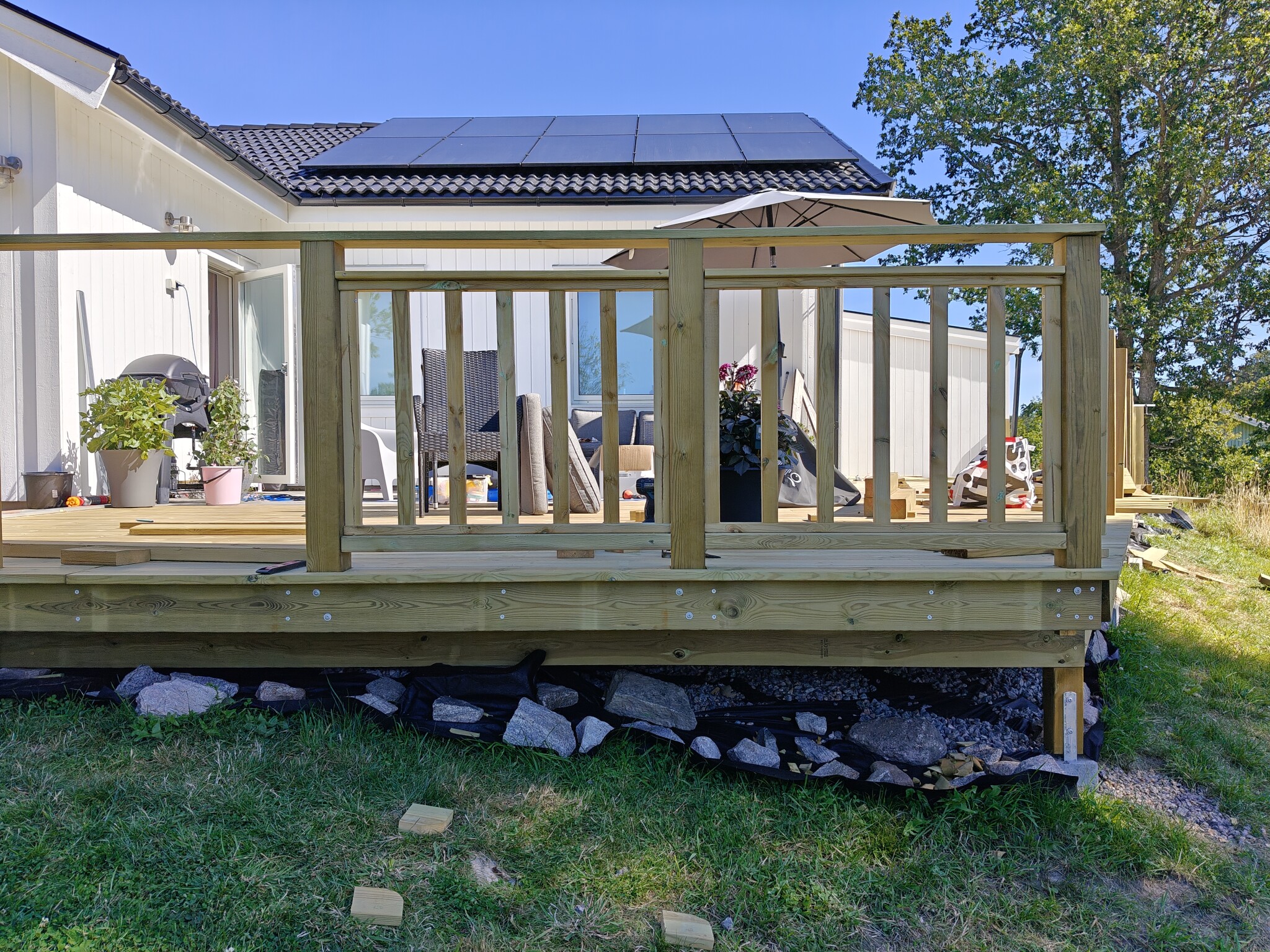 Ja, det var en intressant tanke. Får se om det kan fungera. Utan sidospjälorna på stolpen så ser det hela för fyrkantigt/klumpigt ut. Stolpen (95mm) behövde "rundas av" med något. Men kanske en halv spjäla är tillräckligt?Totte_S skrev: