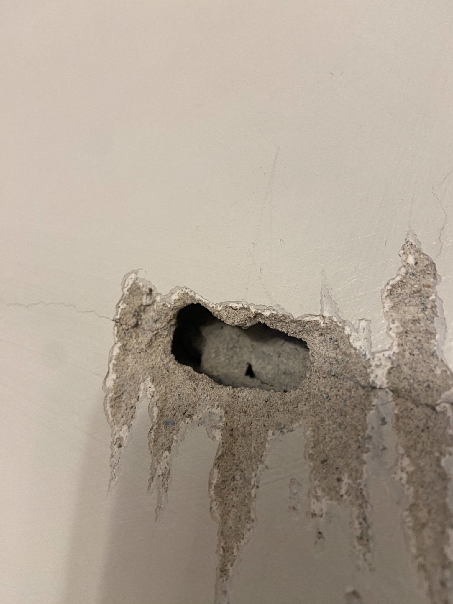 Väggen är i betong och går man och knackar på den så låter den ihålig på flera områden, värst i mitten av väggen där området 0,7x2 meter låter ihåligt.