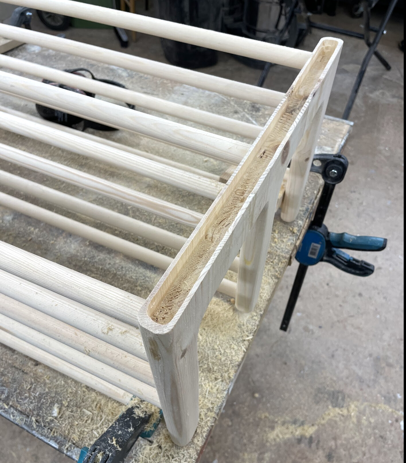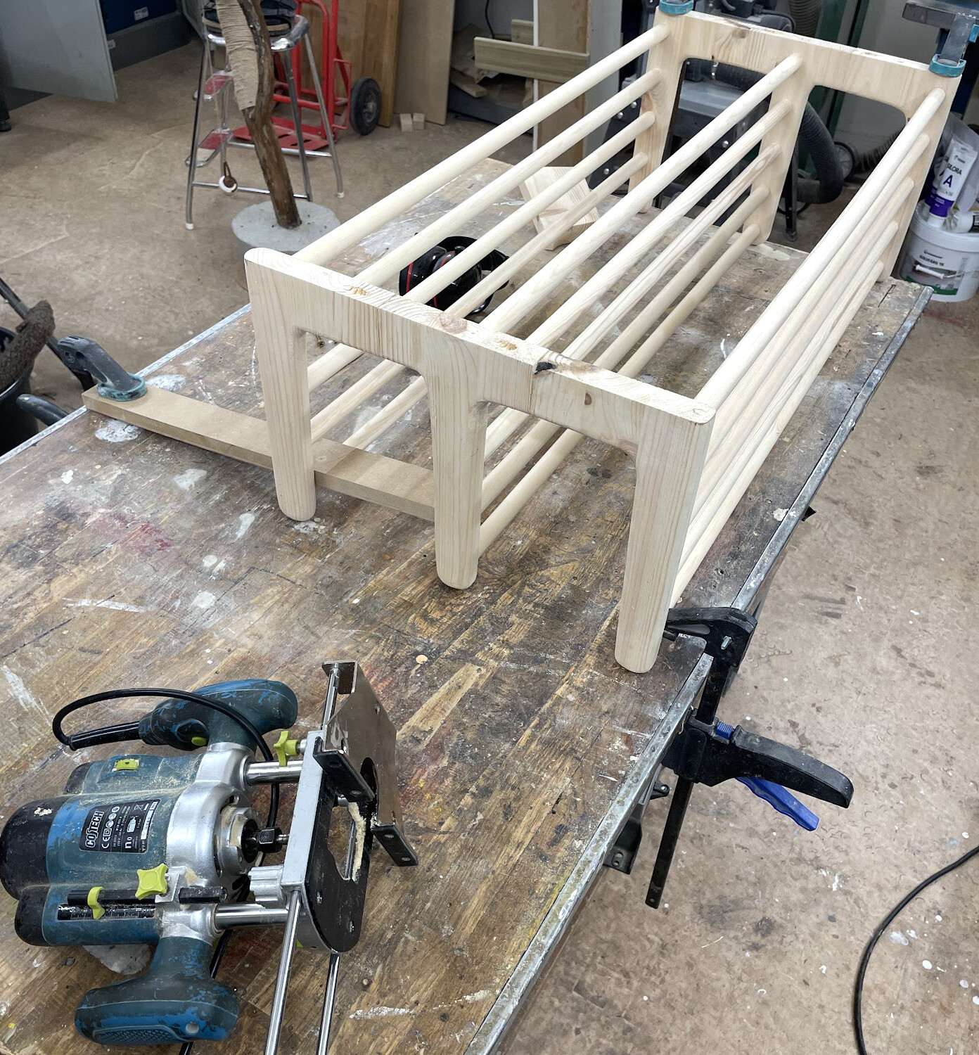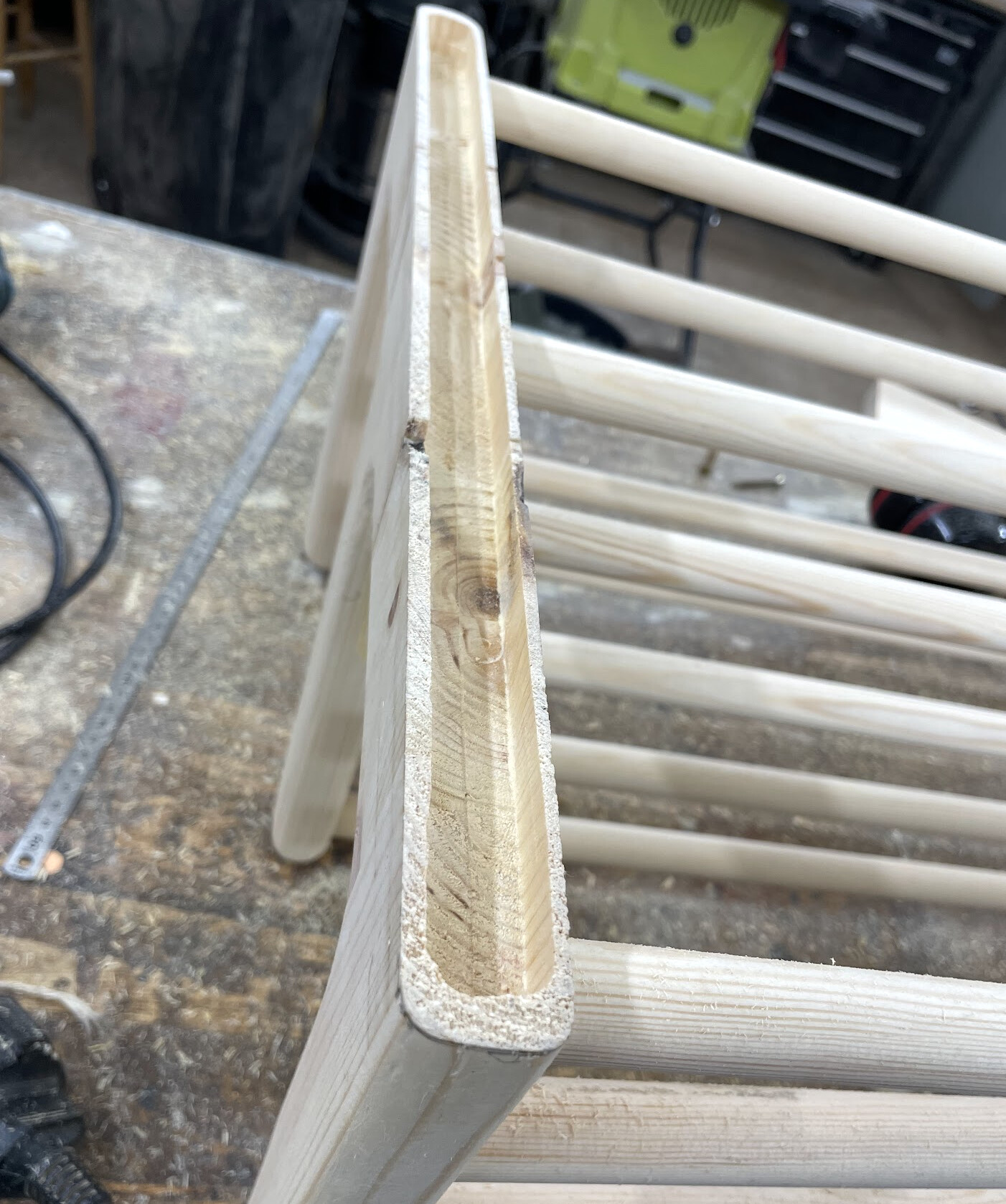 Jag har youtubat överhandsfräs imorse och måste säga, vilket jäkla verktyg! Revolutionerande. Även för att göra rundade kanter vilket jag lekte runt lite med på spillvirke när jag tränade. På skohyllan jag håller på med har jag kört old school hyvel, rasp och slippapper. Nästa gång blir det mer fräs.