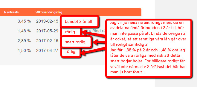 Men eftersom en av delarna ändå är bunden i exakt 2 år till, så hjälper det mig egentligen inte att 3 delar är rörliga, eftersom jag ändå inte kan lämna banken. Därför funderar jag på att binda de 3 delar som är rörliga på 2 år och då kommer alla våra delar bli rörliga samtidigt om 2 år.