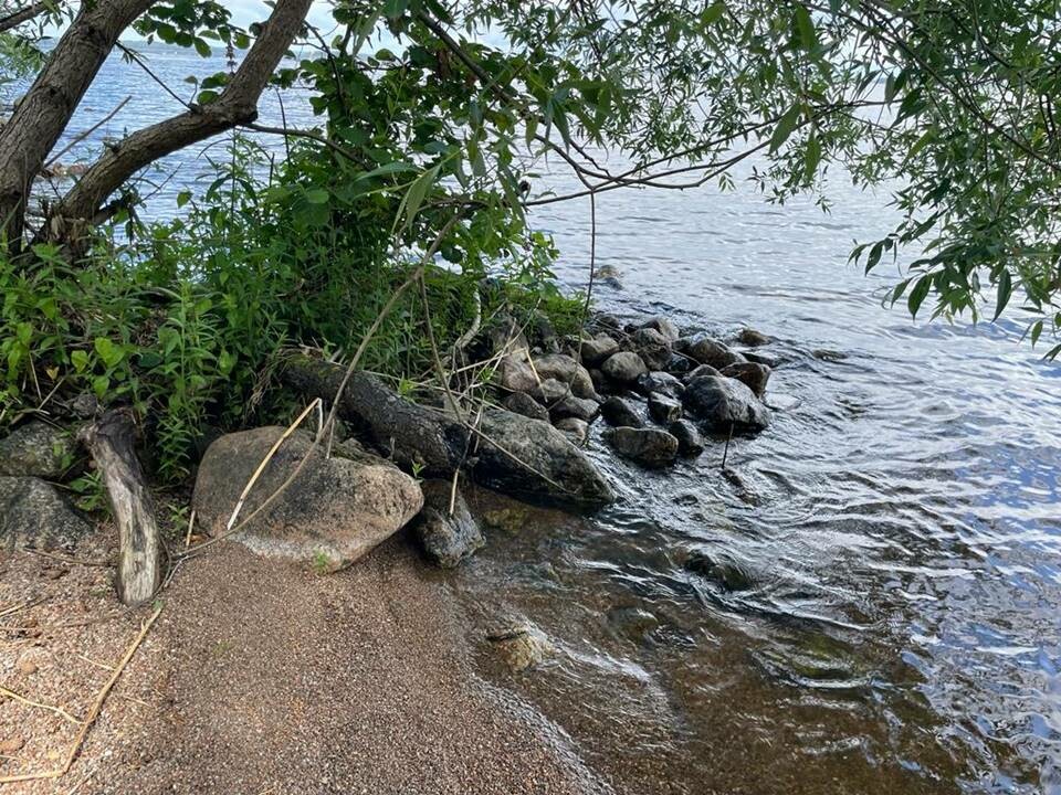 Stranden består dock av grus i storleksordningen akvariegrus. det innebär att det spolas runt väldigt mycket och har olika nivå från år till år. vattnet sköljer bort sten under t.o.m. större stenar vilket får dem att sjunka något emellanåt.