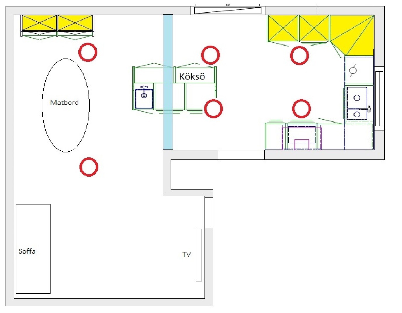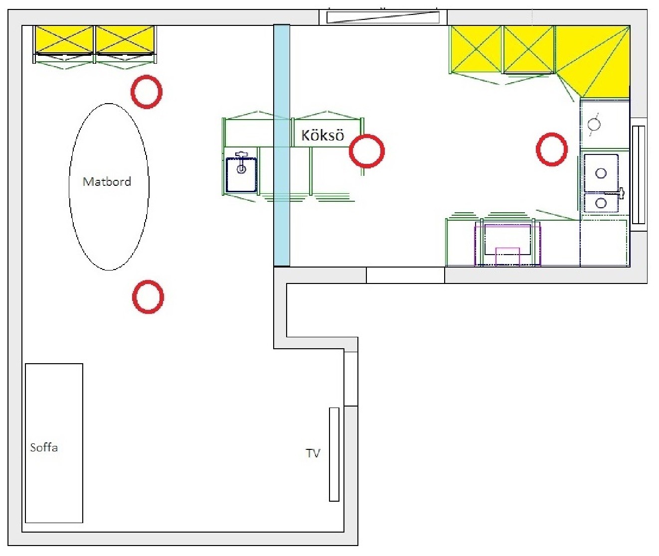 Den ljusblå rektangeln som sträcker sig över köksön är en balk som sticker ned ca 25cm från taket. De gulmarkerade köksskåpen är högskåp, övriga är vanliga låga skåp. Ingen belysning är utritad. Ritningarna är inte skalenliga och det saknas fönster samt finns fler rum utanför ritningarna som inte är utritade. Högtalarna är markerade som röda cirklar. Högtalarlådorna i matsalsdelen/över matbordet sitter redan på plats.