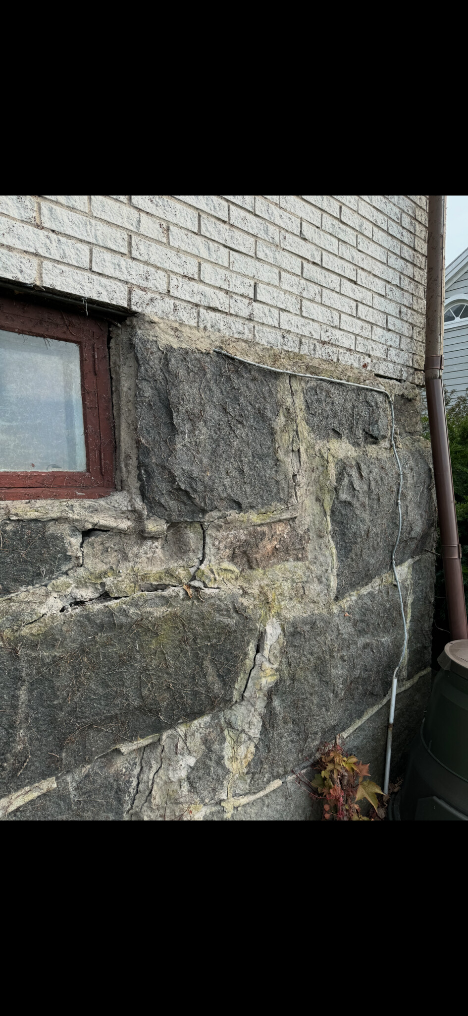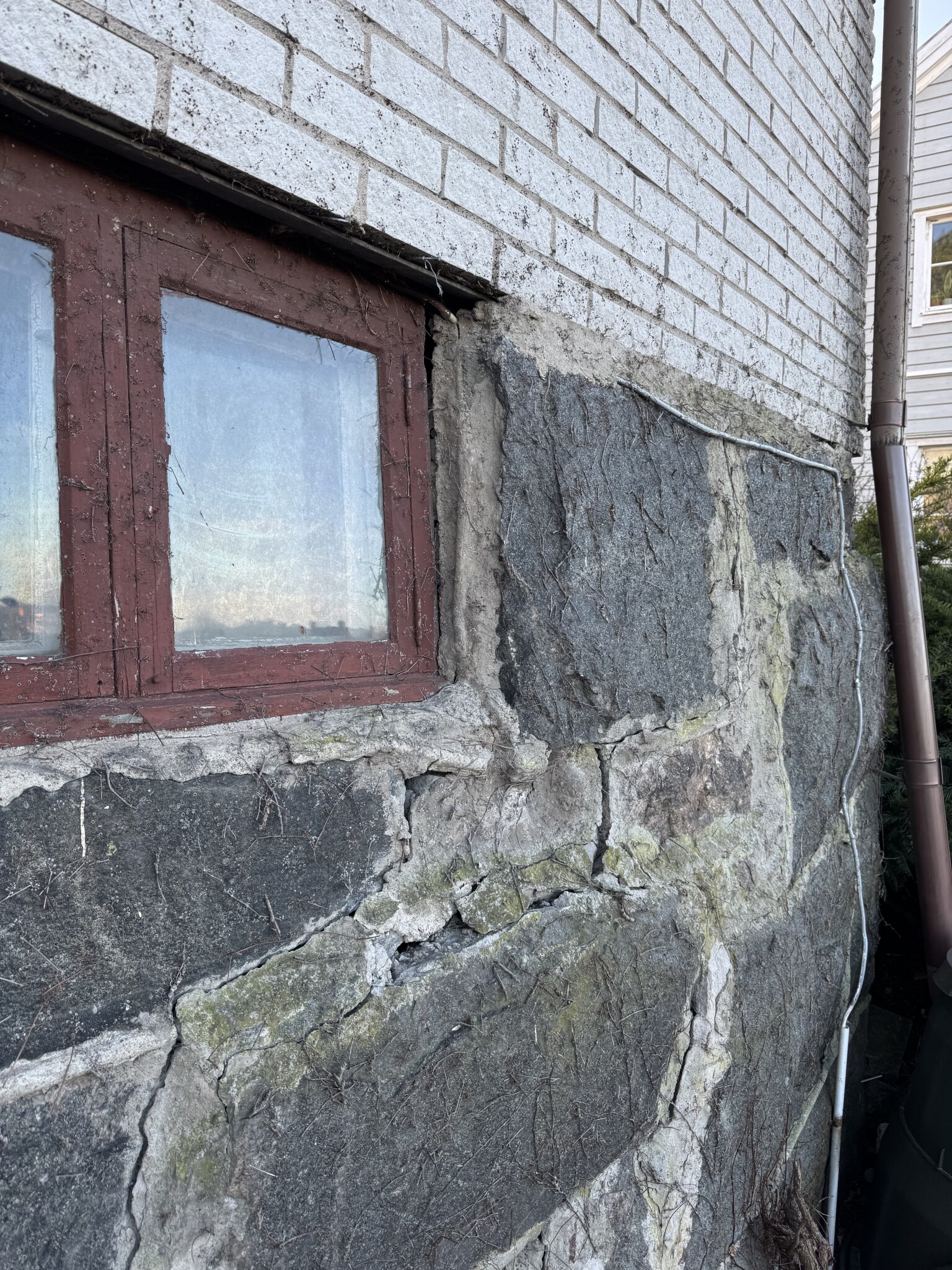 Jag bor i ett hus från 1919 som byggts i en slänt på en naturstensgrund. Ena hörnet har satt sig med åren och som ett resultat har grunden skjutit ut i hörnet ca. 10 centimeter. Huset är ett dödsbo så jag kan inte säga säkert när, men man kan se tydliga lagningsförsök som spruckit upp på nytt. Muren var dessutom helt klädd i växtlighet när vi tog över det.