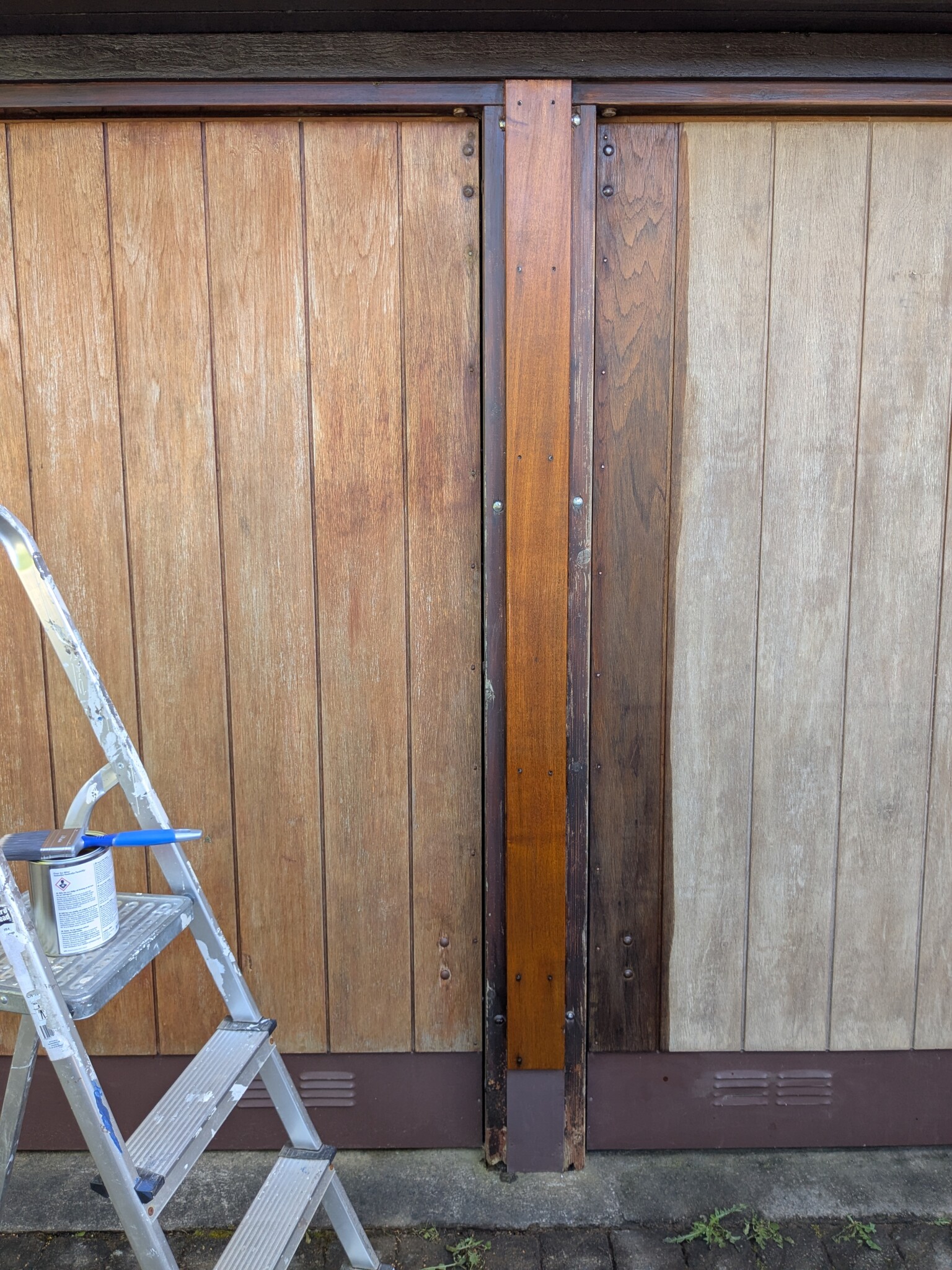 Efter (vänster port endast tvättad, höger port är slipad, en planka är oljad samt plankan mellan portarna):