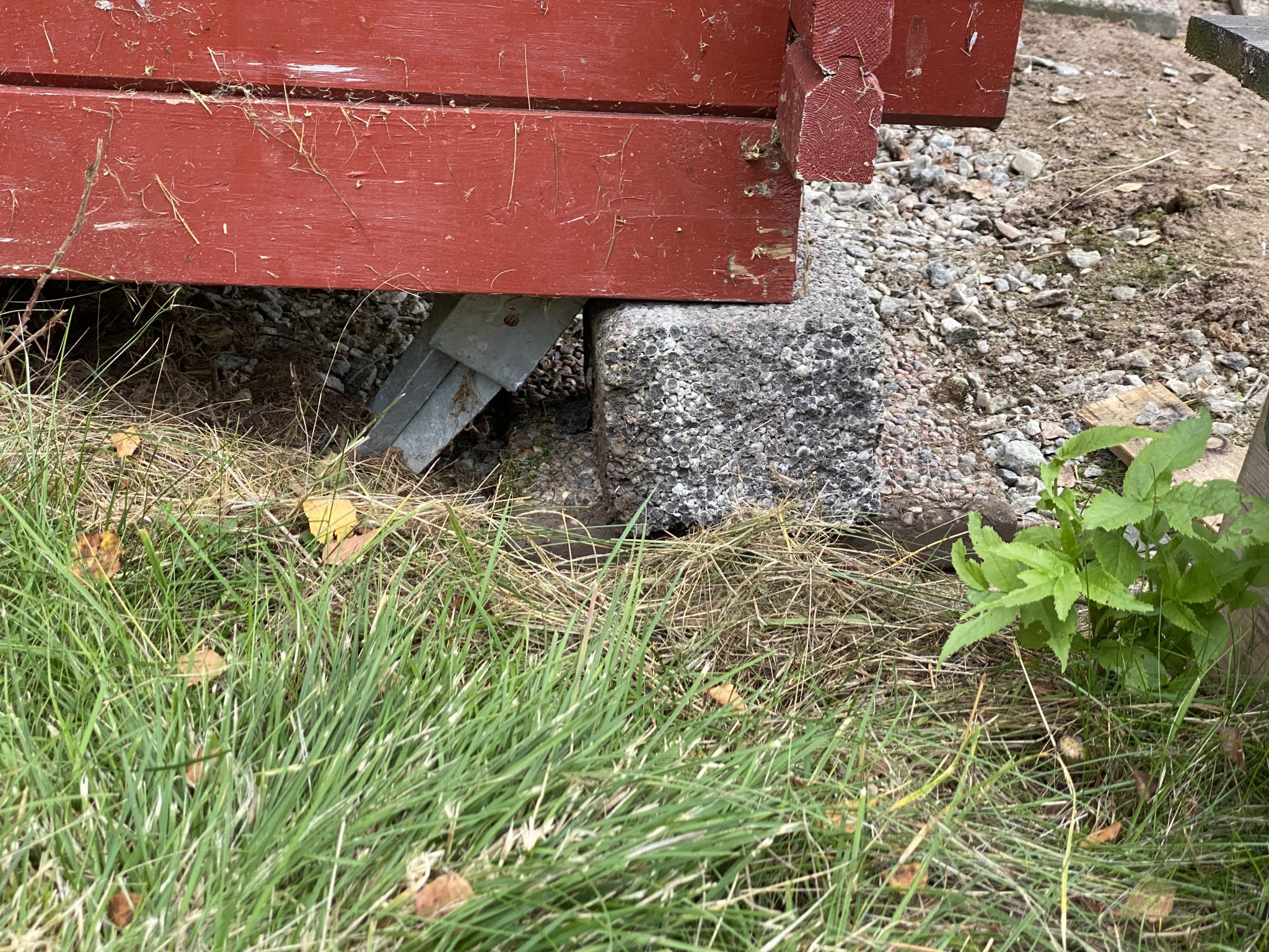 Den står i en väldigt svagt sluttande slänt mot en sjö. Tyvärr byggdes den upp av min (numera bortgångna mor) och hennes karl. Marken grusades nog av ordentligt men sen ställdes den på 70x70 stolpspjut() med stolpar upp mot bjälklaget. Stugan har nu vridit sig och hasat ner mot sjön. Kanske 10cm lite här och där.