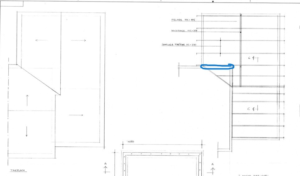 Jag delar känslan att väggen sannolikt är bärande! Idag bygger man gärna fribärande w-takstolar, men det gjorde man inte lika mycket förr i tiden...