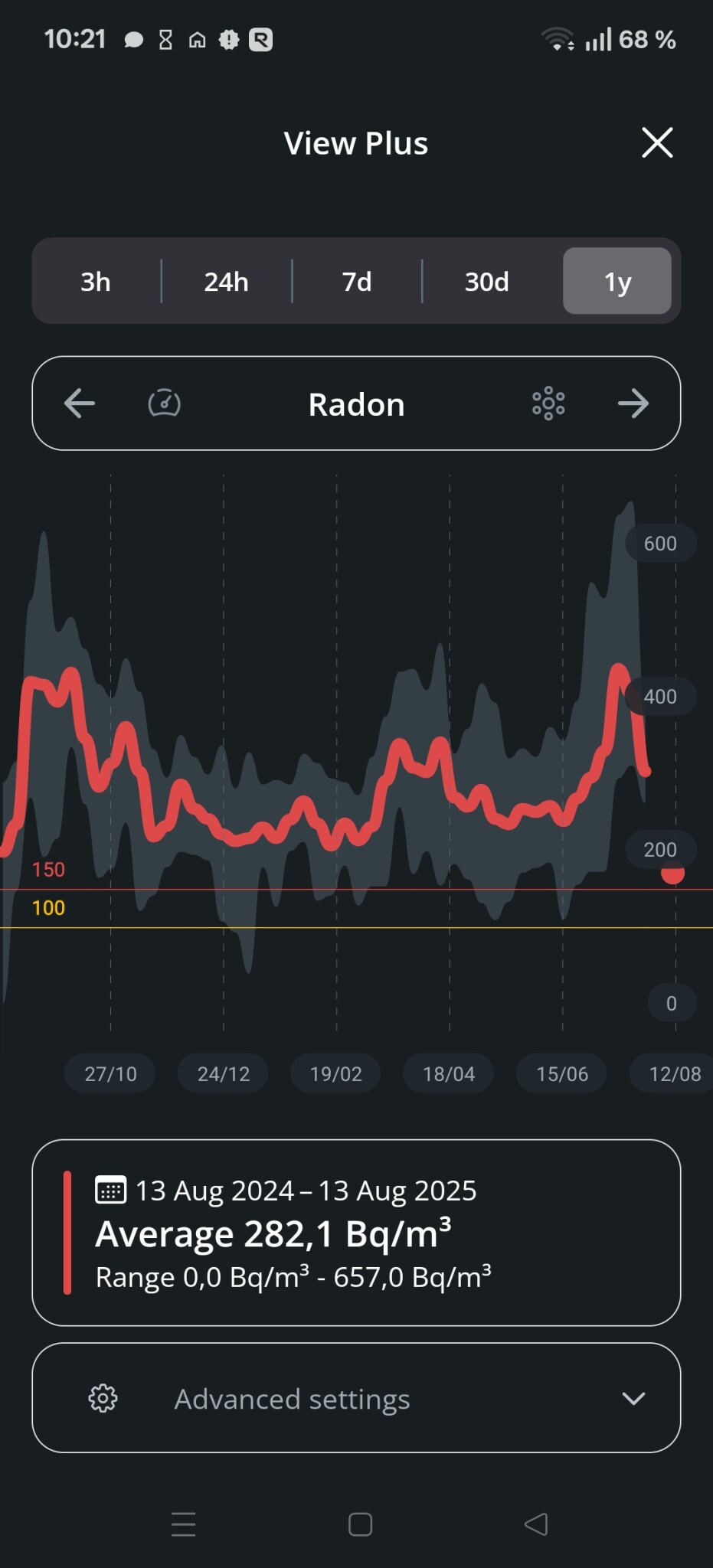 Min airthings visar ju mer varierande data eftersom man har varje datapunkt tillgänglig, så snittet beror på exakt vilka dagar man tittar på. Appen kan inte visa snitt över 90 dagar utan man kan välja 30 dagar, eller ett år. Där ser jag att mitt 30-dagars snitt hamnar mellan 200-300 ungefär, och sett på hela året (hela mätperioden som ännu inte är ett helt år) så landar jag på 282 Bq/m3 (max 657). Så skulle säga att airthings är rätt akkurat ändå, eftersom radonmätning ändå är ett rätt grovt mått. Tänk meterstavar snarare än mikrometer.