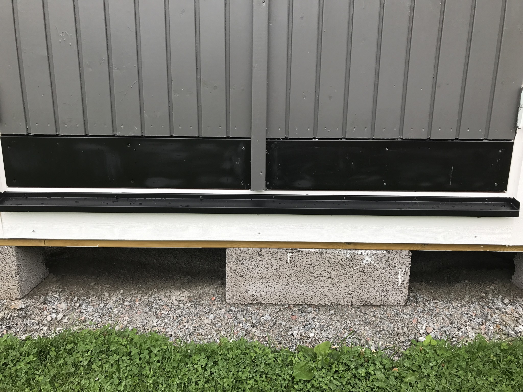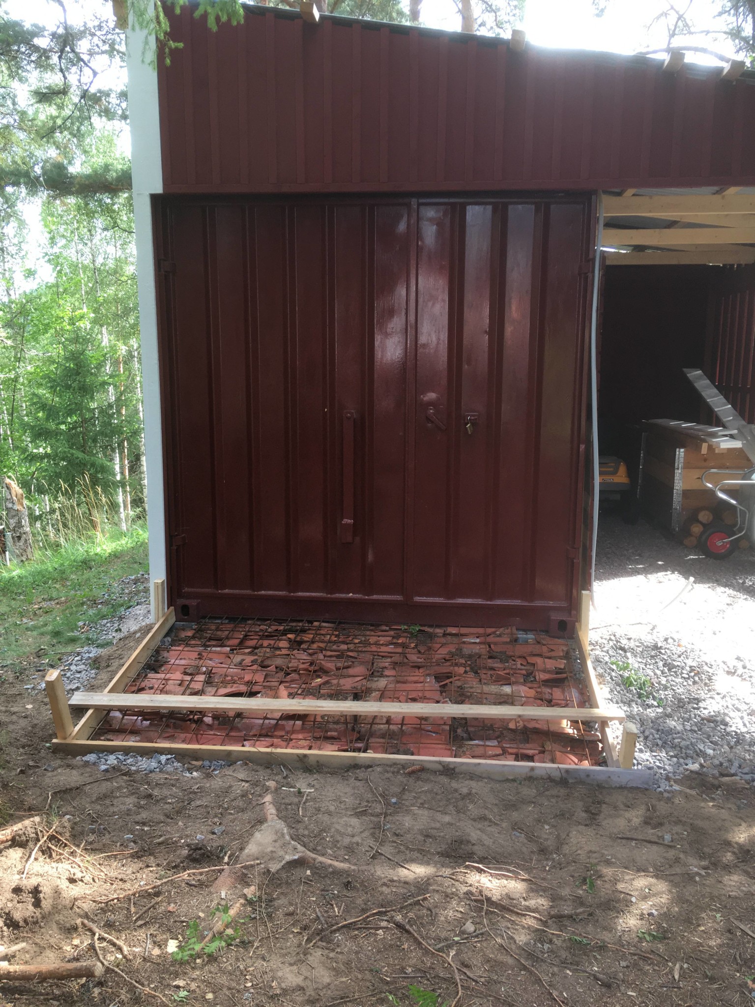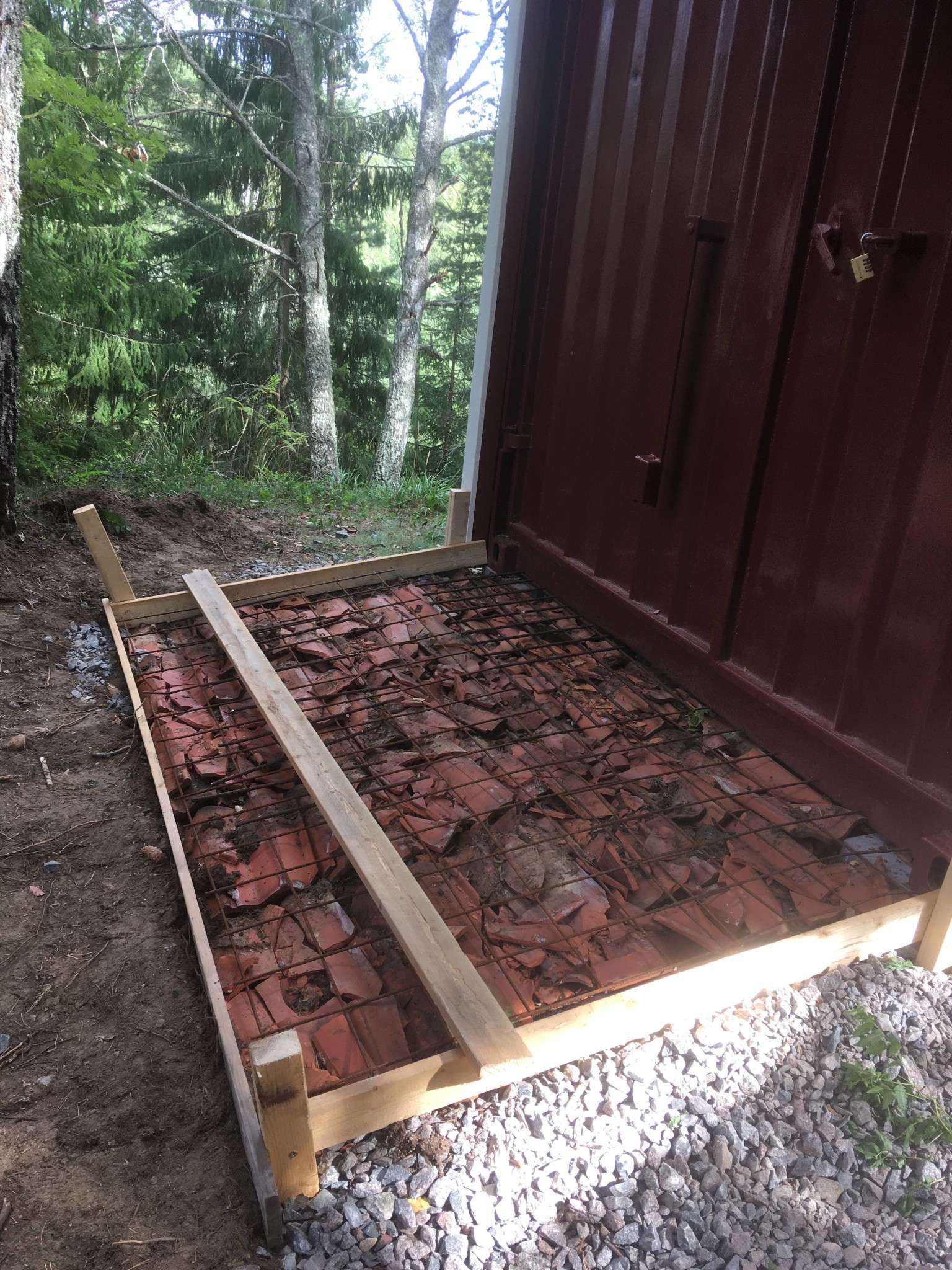 Vi gjöt en ramp i betong. Gamla tegelpannor i botten, armeringsnät på det, och singel runt om.