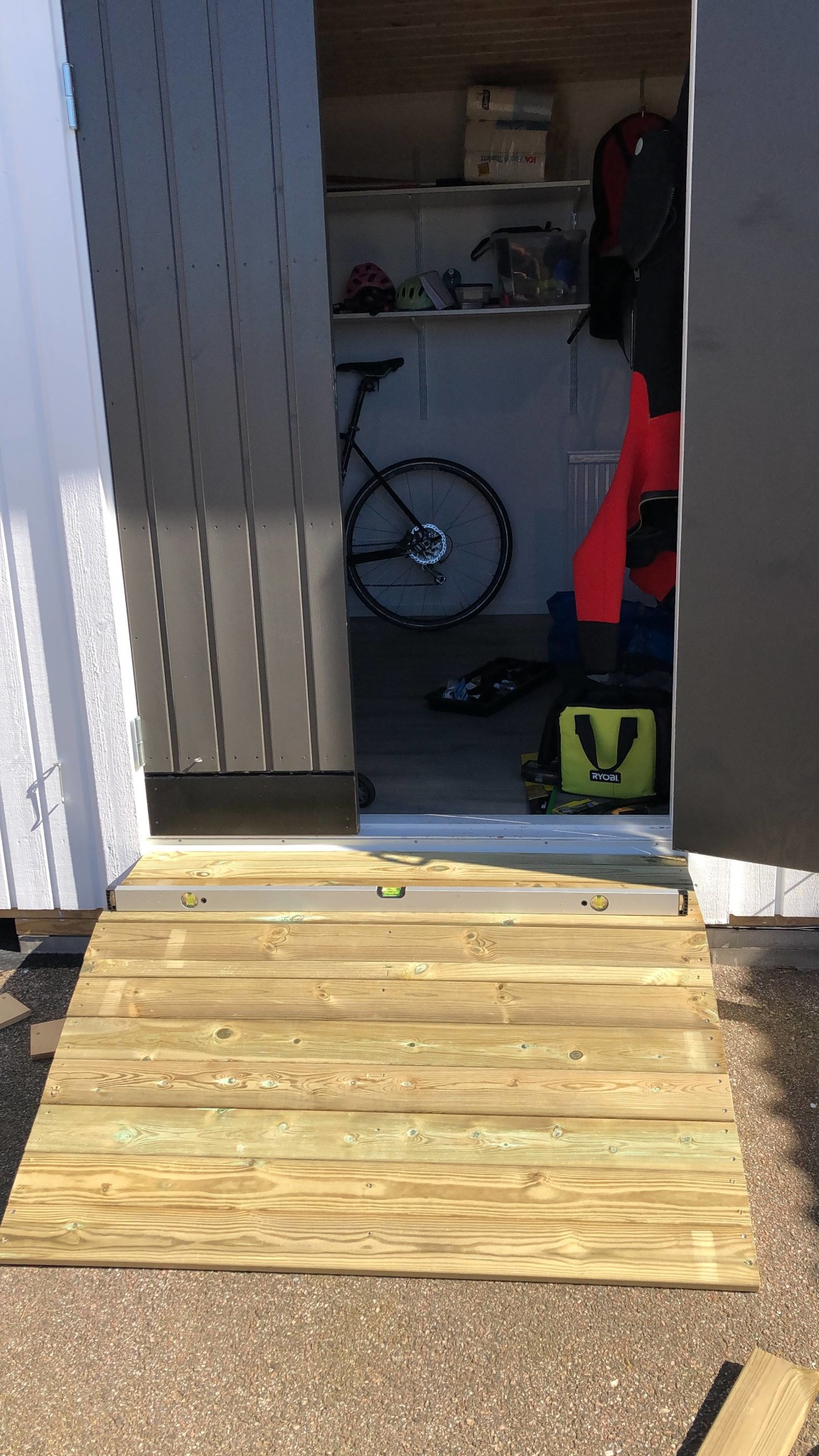 Det beror ju lite på vilken belastning det är fråga om. Om det är fråga om en lättare last, t.ex. du själv och en gräsklippare, kan du tillverka tre stödreglar av tryckimpregnerat virke enligt nedanstående skiss som du fäster med vinkelbeslag. Lämplig dimension att utgå från är 45x95 mm. Ovanpå dessa skruvar eller spikar du tryckimpregnerat trallvirke på tvären. Skall reglarnas ände vila direkt på marken bör de vara av klass NTR/A, annars räcker det med NTR/AB.