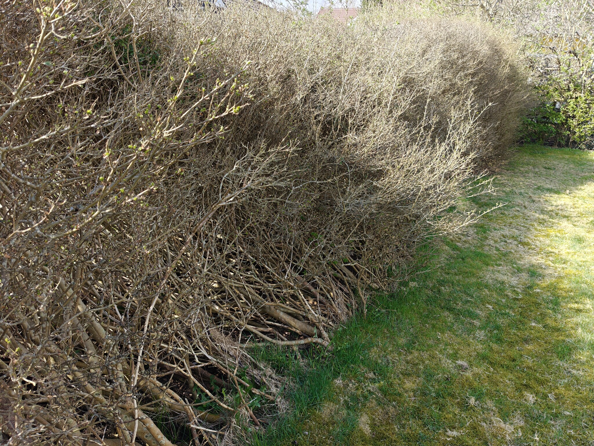 Man kan också vänta någon månad tills alla bladen är framme och klippa, om än inte 20-30 cm, så iaf klippa in stramt på bredden och ordentligt på höjden (kanske halvvägs ner?).