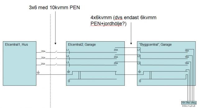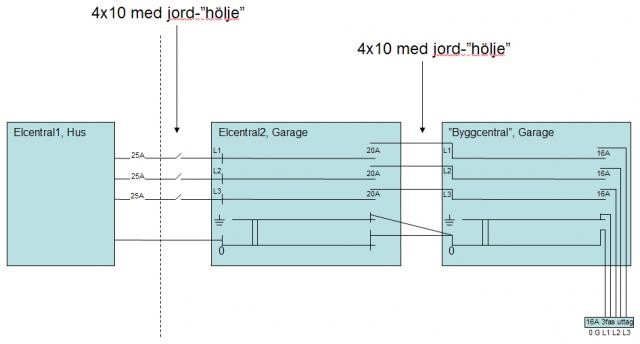 Elen från huvudcentralen (elcentral1) i huset är dragen till ytterligare en central i garaget, avsäkrad med 25A i central1. HB före central2 i garaget. Sedan är det dragit en 4 ledare till ytterligare en "byggcentral" som är avsäkrad med 20A i central2
