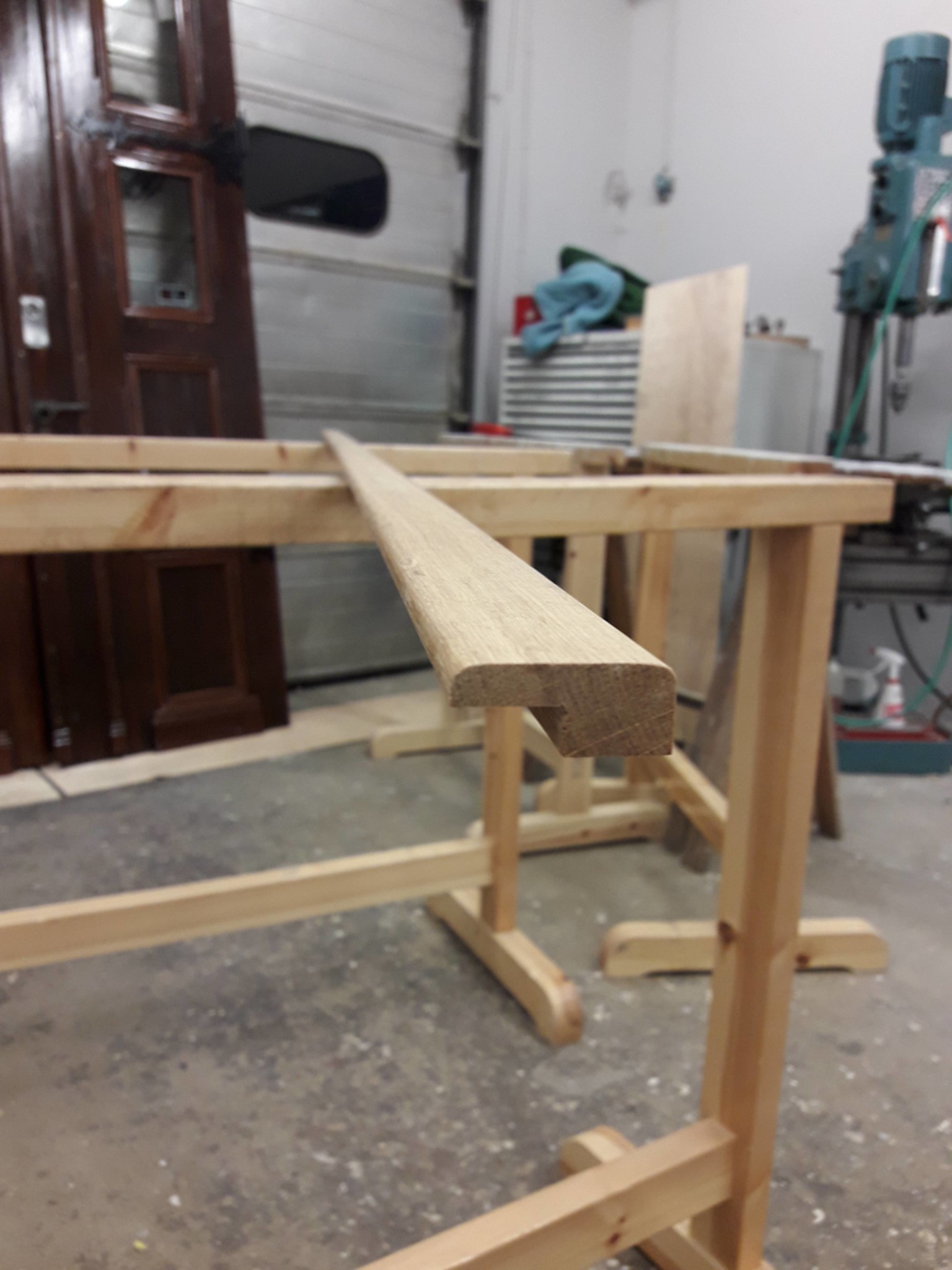 Helg på snickeriet brukar innebära att halva vardagsstyrkan (de som beter sig som folk!) går hem och har helg. Resten brukar stanna kvar och pyssla och dessutom brukar det bli förstärkning av helgstyrkan (vilken består av Jesper, som går i skolan på vardagarna). Idag var en sådan dag och förutom de vanliga löpande uppgifterna så fick Jesper också i uppgift att tillverka en enkel liten övergångslist. Ett enkelt och snabbt jobb, inlämnat i fredags av en av våra återkommande kunder, en byggfirma som tydligen trixade lite med två golv som skulle mötas men var i olika höjd. Skiss och mått var grovt nerklottrade på baksidan av en skrynklig papperslapp.