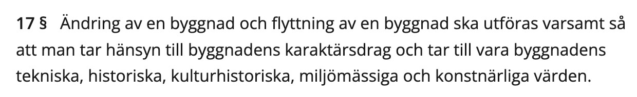 Det finns reglerat i 8 kap 17 § PBL, det s. k. varsamhetskravet:J Johan_kl skrev:Är regler i PBL om tillbyggnad är ”varsamt placerat” eller ej reglerat lite tydligare? Dvs finns risk att jag får problem i tillsynsärende om handläggare tycker tillbyggnaden ansluter till fel ända på huset? I mitt fall är det omöjligt att på ett bra vis lägga en tillbyggnad på baksidan såsom handläggaren förordnade skulle vara ”varsamt” att göra.