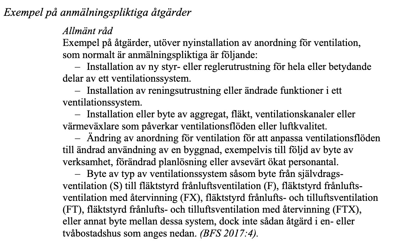 Idag är det ju bara anmälan om man gör en väsentlig ändring av huset hela ventilation som behöver anmälan. Tex om man går från självdrag till FTX i bostadsdelen.