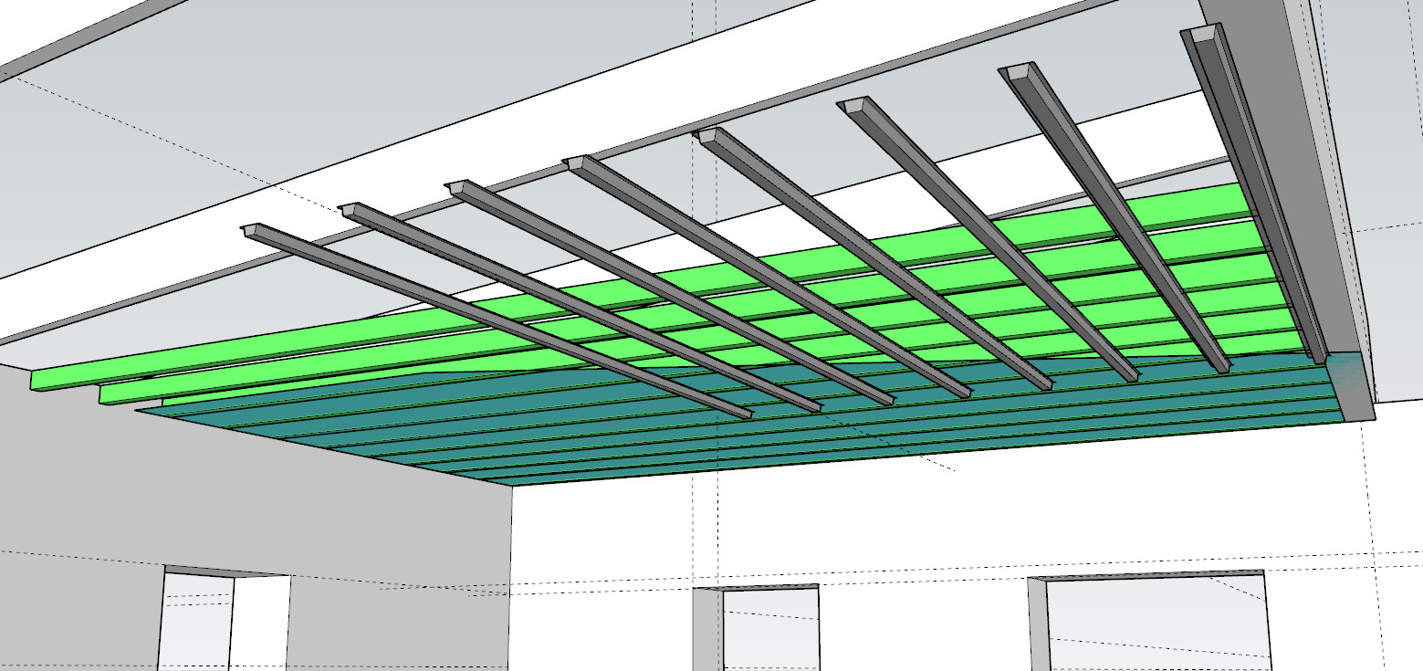 Min idé är att fästa stålreglar längs med ytterväggar och limträbalk och sedan i dessa sätta stålreglar. Men då spannet är lite drygt 4m tänkte jag förstärka dessa med hålband/stålreglar uppifrån befintliga takreglar/sparrar.