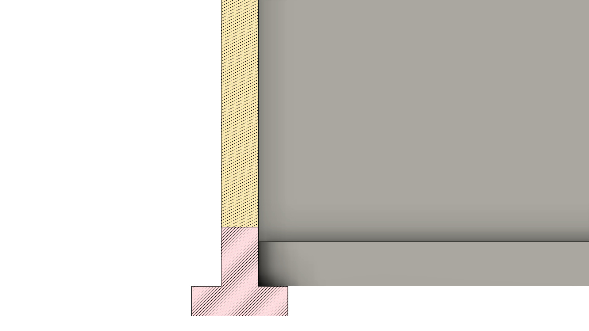 Det gulmarkerade är väggen ovan mark. Det rödmarkerade är väggen och sulan under mark. Marknivån är samma som golvytans nivå. Under det gjutna golvet ligger längst ned 10 cm Isodrän-skiva, sedan 10 cm cellplast, radonduk, och sedan 10 cm cellplast. På det ligger sedan betonggolvet.