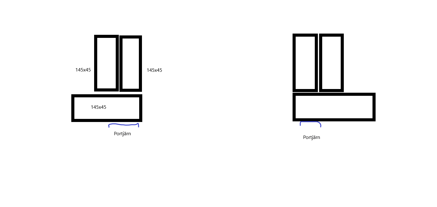 I instruktion till portar står det dubbla 45 reglar, med minst 95 brett på var sida om port. Tänker att jag borde kunna lägga då 2st 145x45 i kloss, sen en 145 med bredsida mot portjärnen? Det borde funka visst? Bifogar en snabb bild, uppifrån sett: