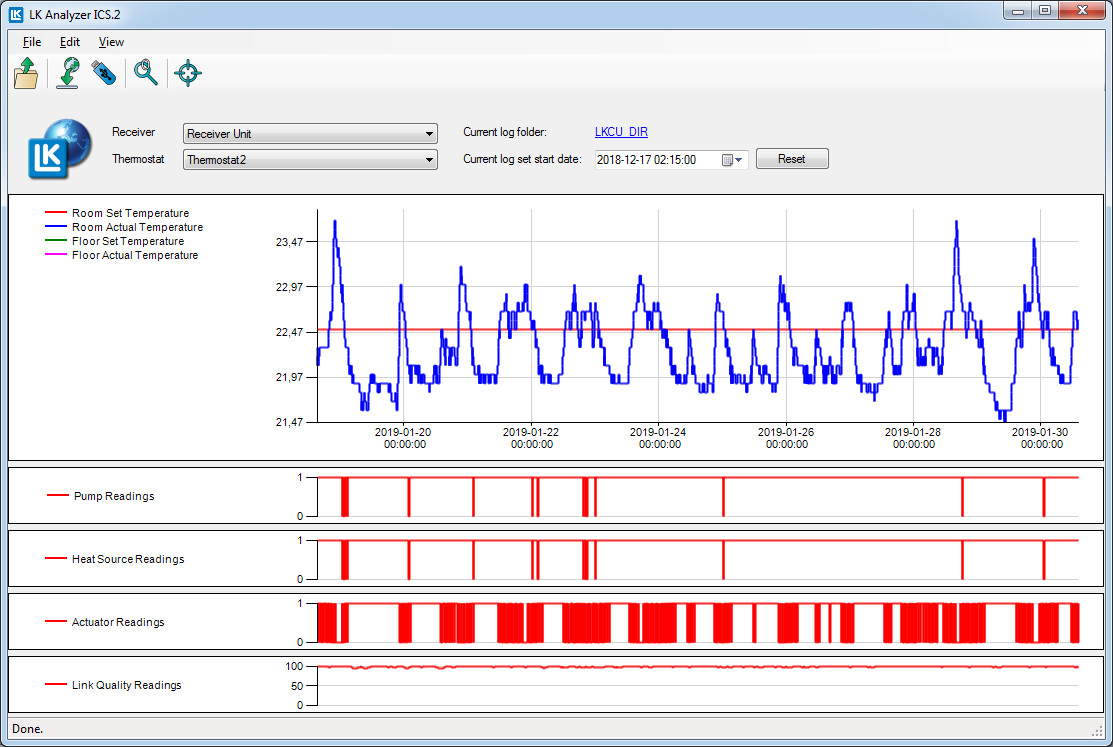Termostater: Trådlösa LK rumtermostater inställda på 22.5 grader överallt utom i badrum (där det är 23.5 grader).