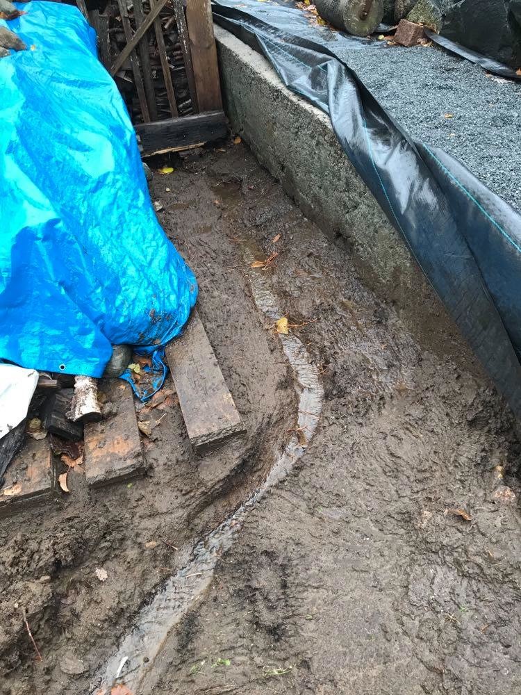 • Provvisoriskt dike i en blöt gräsmatta vid en mur för att leda bort regnvatten.
