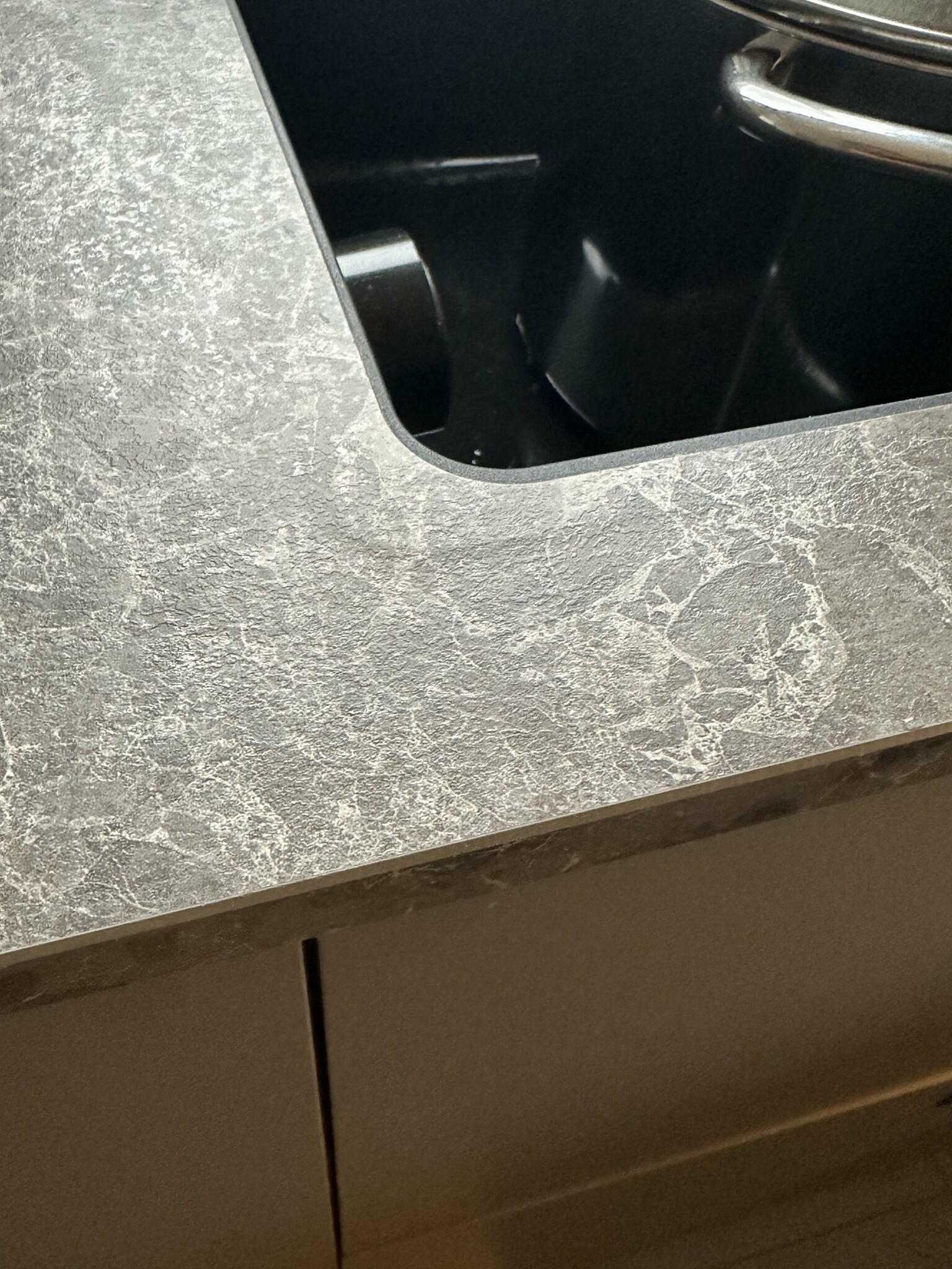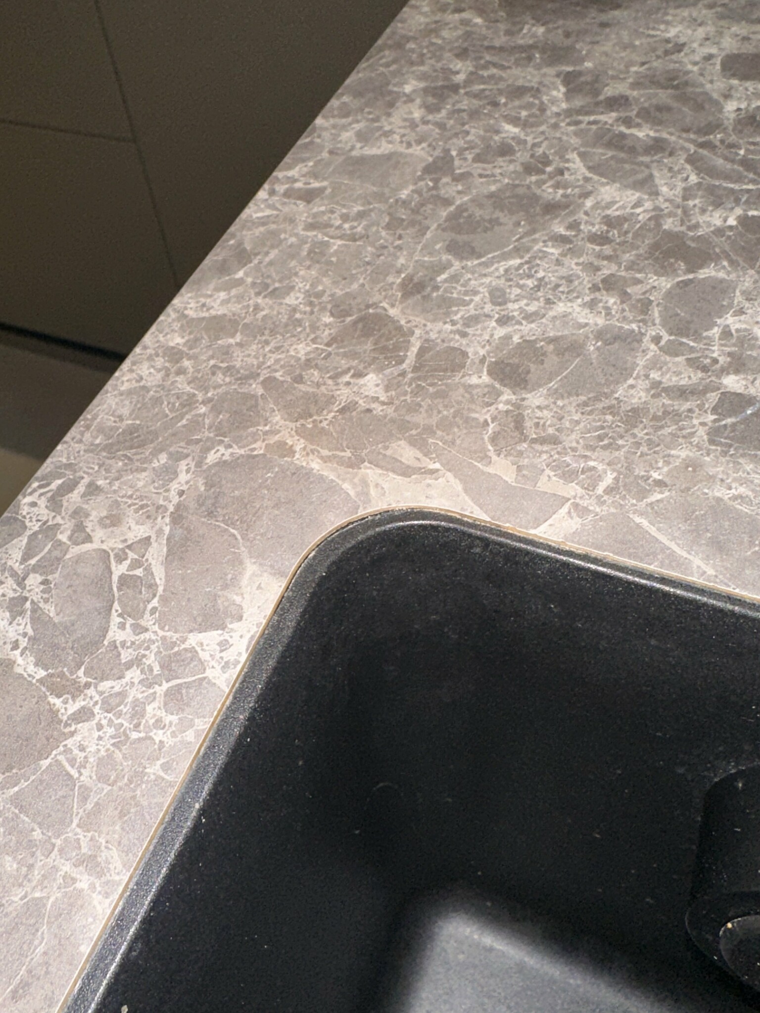 På den bifogade filen så ser ni att det blivit som en kant, lite upphöjd, som skiljer sig rejält från resterande bänkskivan. Det ser ut som det blivit något förhöjd från den underlimmade diskhon och det ser framförallt riktigt bedrövligt ut men börjar också bli en liten förhöjning när man känner om man stryker med fingret. Det är just nu rätt rejält i kanten men det börjar också bli en "linje" som går längst diskhon (åt höger) och det kommer nog bara bli värre med tiden.