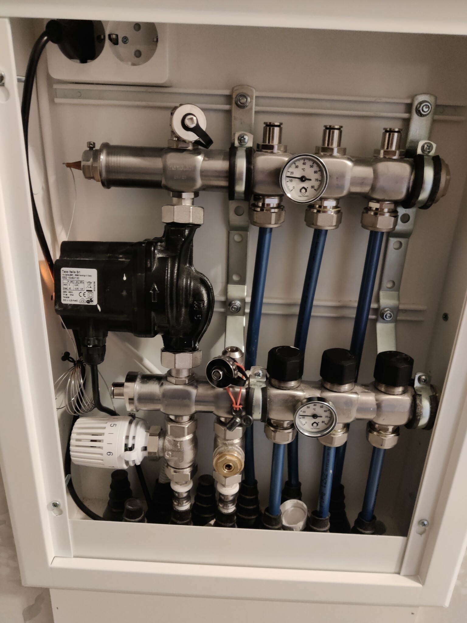 Den termostat till vänster i mitten som ser ut som de som sitter på element är den jag sänkte med. Ok tack ska prova. Men hur gör jag för att reglera värmen om inte där? Är ventilhuset i direkt anslutning till den termostaten? Ursäkta okunskapen. Mvh