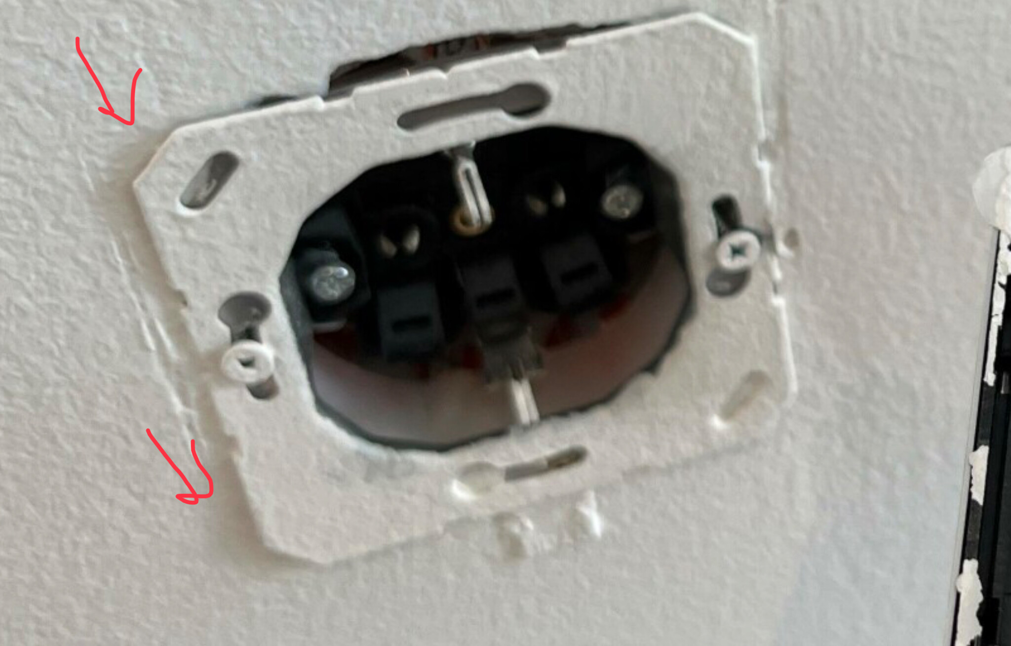Jag tror dosan sitter (för) långt in och när skruvarna dras åt hårt kan plåten böja sig så det blir en glipa mellan vägg och plåt som på bilden, se pilar.