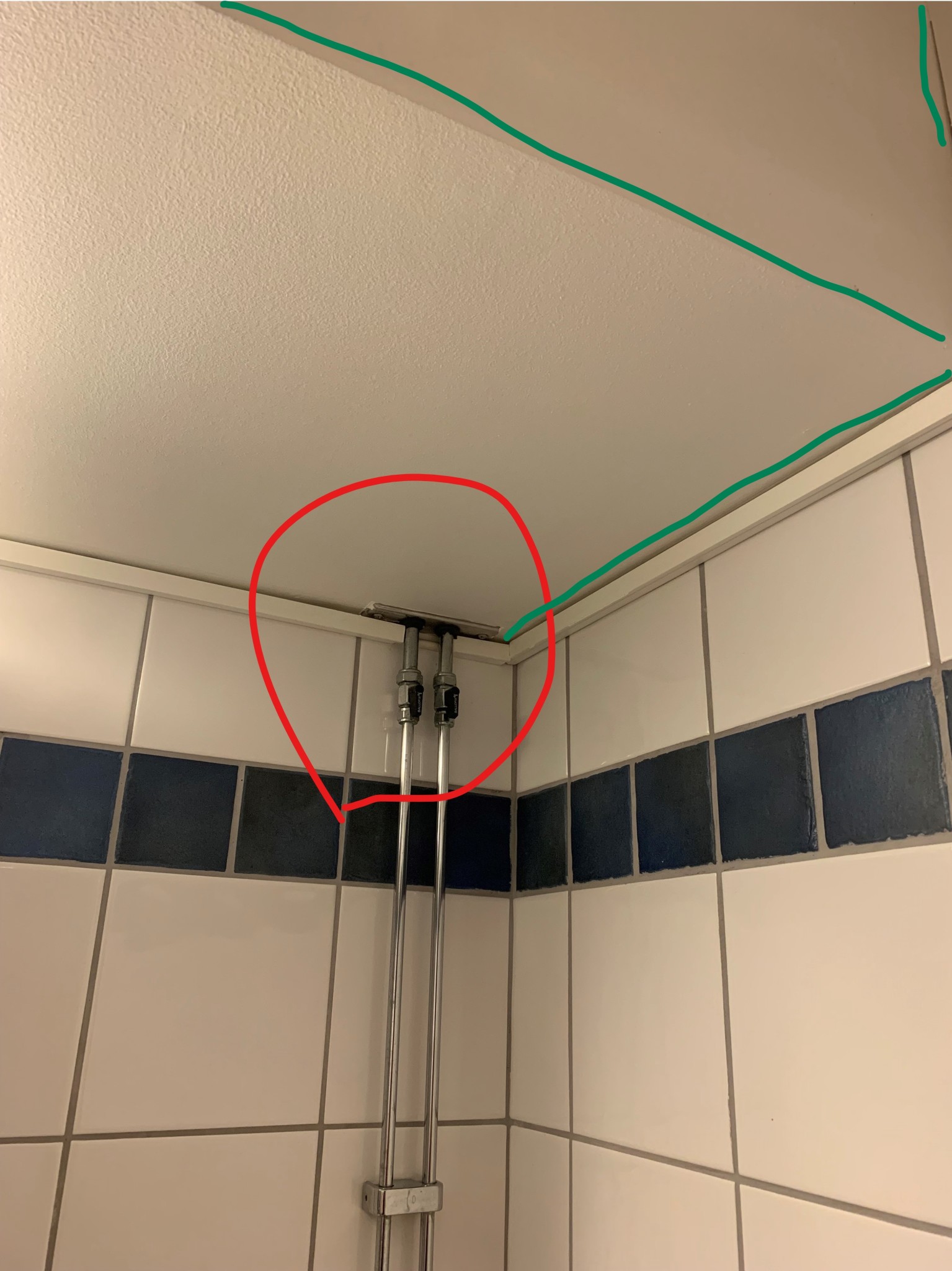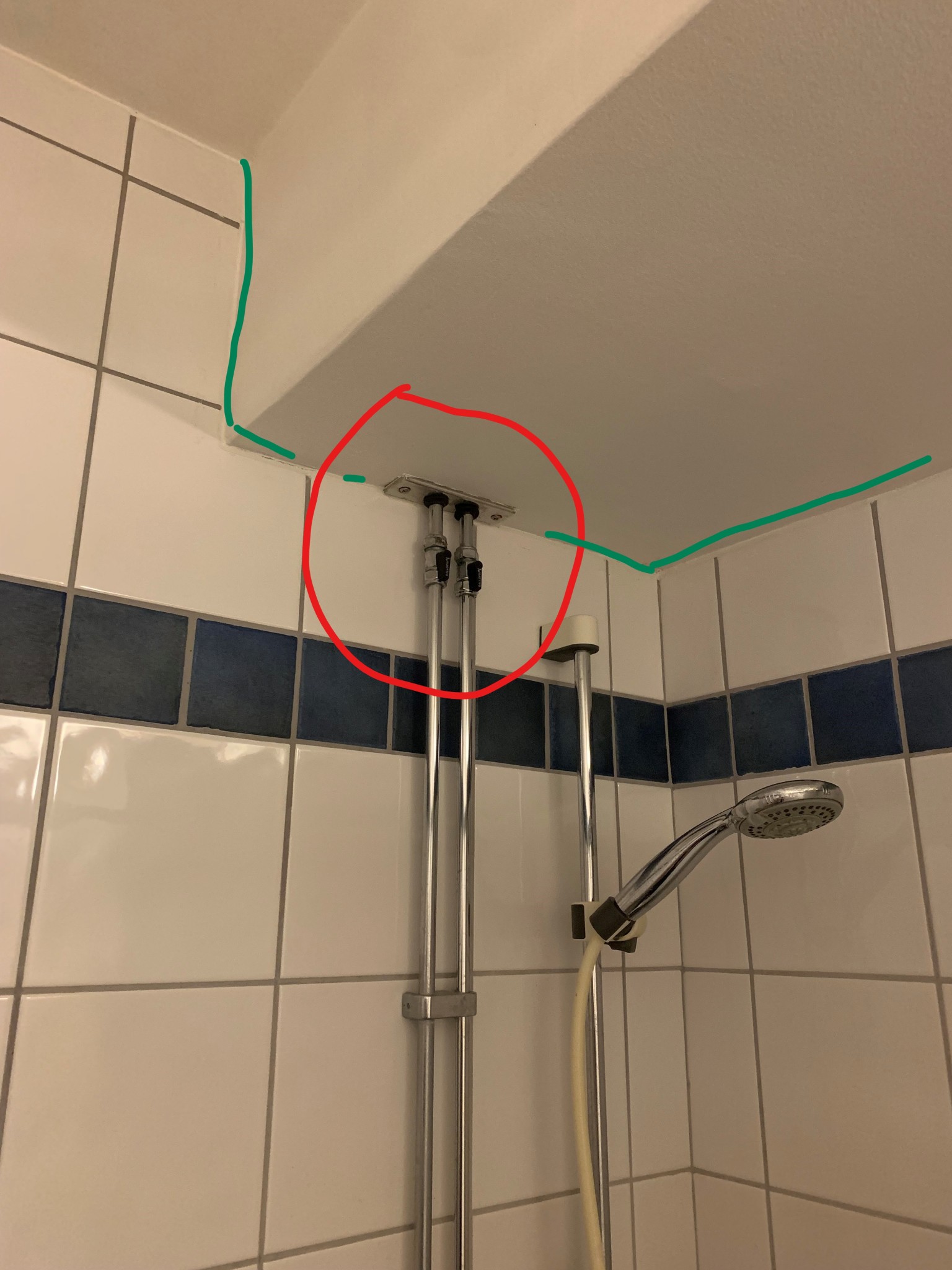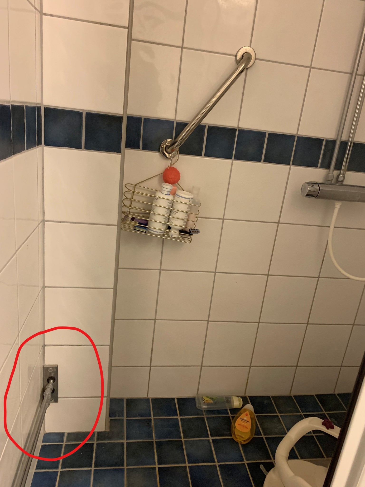 Bild 1 visar rören som kommer ner till duschen från ett schakt i taket.