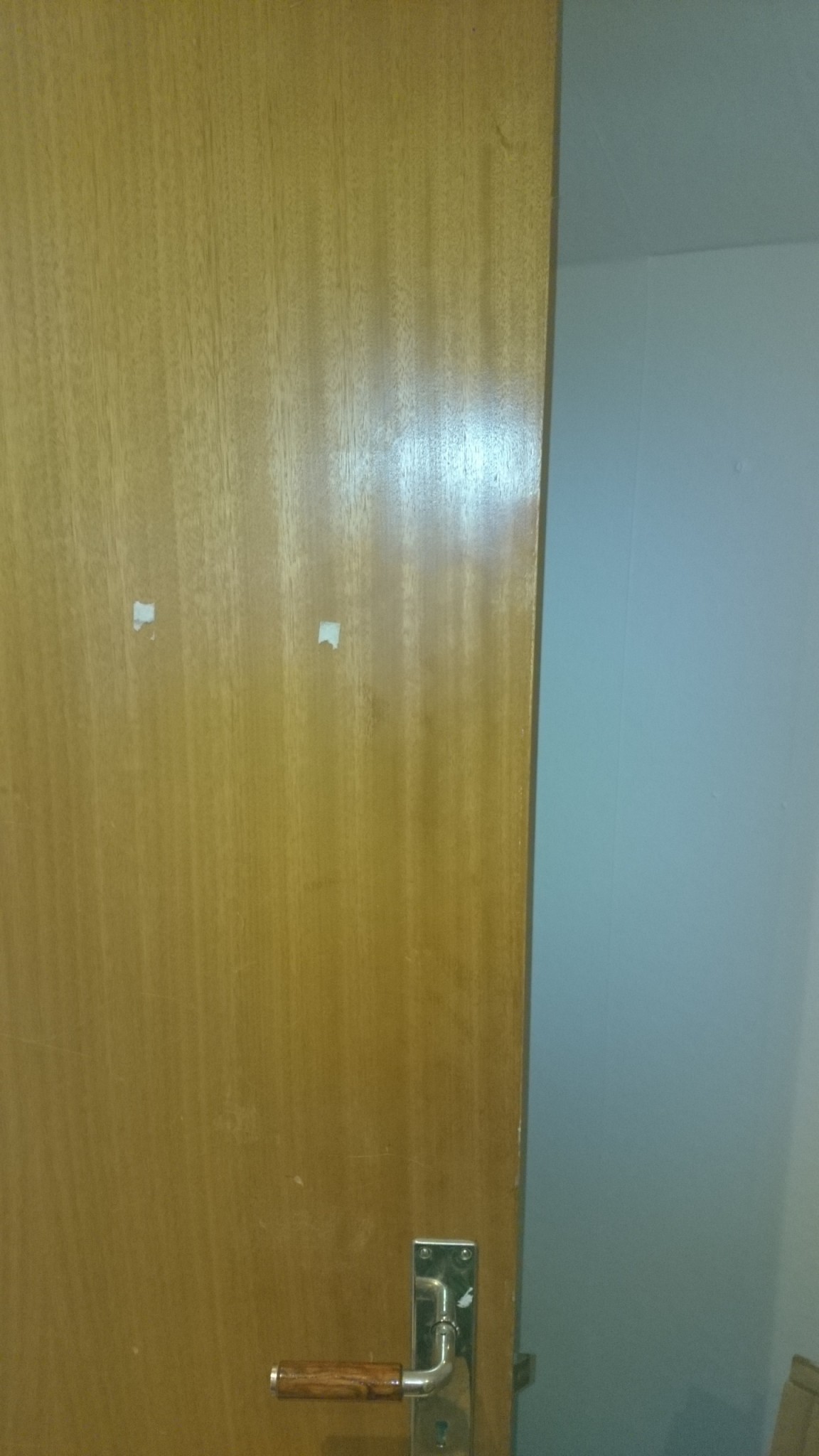 En annan variant är att du använder lagningsvax med samma eller något mörkare färg än dörren. Ex http://www.kreatima.se/produkter/fa...ch-bets/mobelrenovering/baowachs-lagningskitt