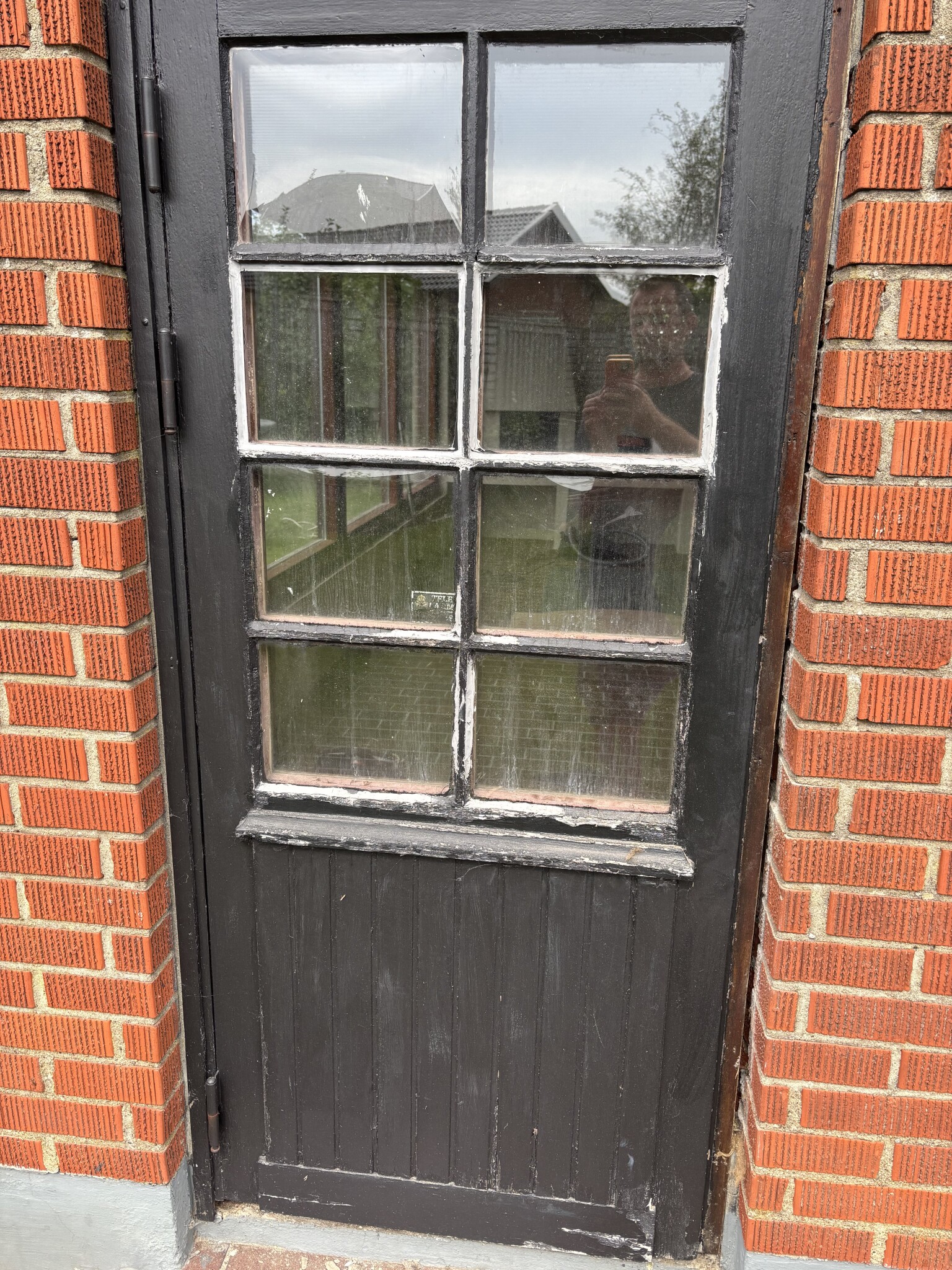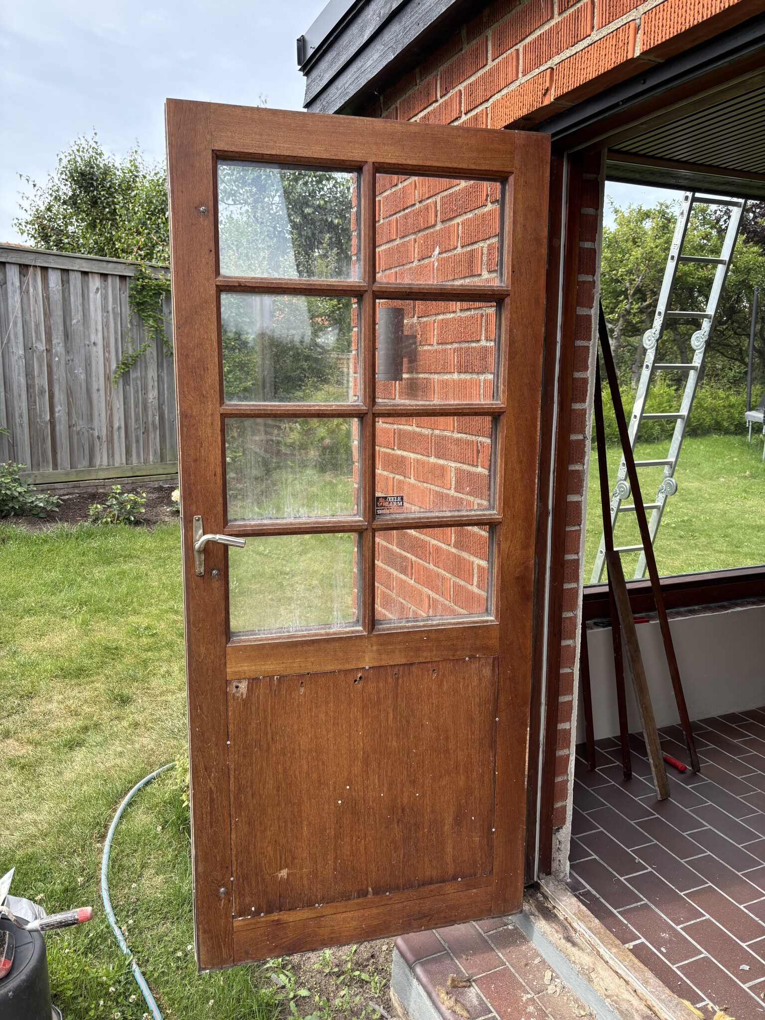 Dörr och karm skall renoveras då det är specialmått och därmed extremt kostsamt att hitta ersättare. Och speciellt då vi vill behålla teaken.