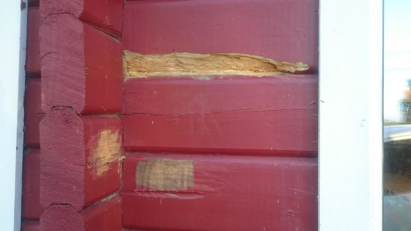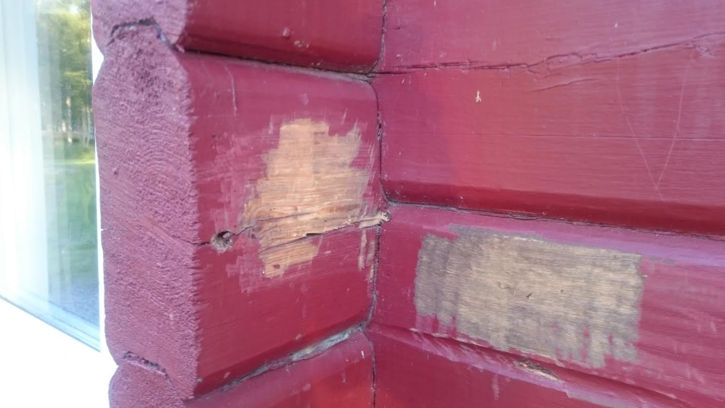 Har ett litet timmerhus där fasaden inte är i så gott skick, särskilt väggen ner mot vattnet som fått lite skador som jag tänkte reparera. Som jag förstått det så ska man hugga ur allt dåligt trä och sedan limma dit en ny bit, men jag kan inte riktigt avgöra hur mycket jag ska ta bort. Det värsta är borttaget, det var mycket mörkare och det gick att trycka hål med fingertoppen.
