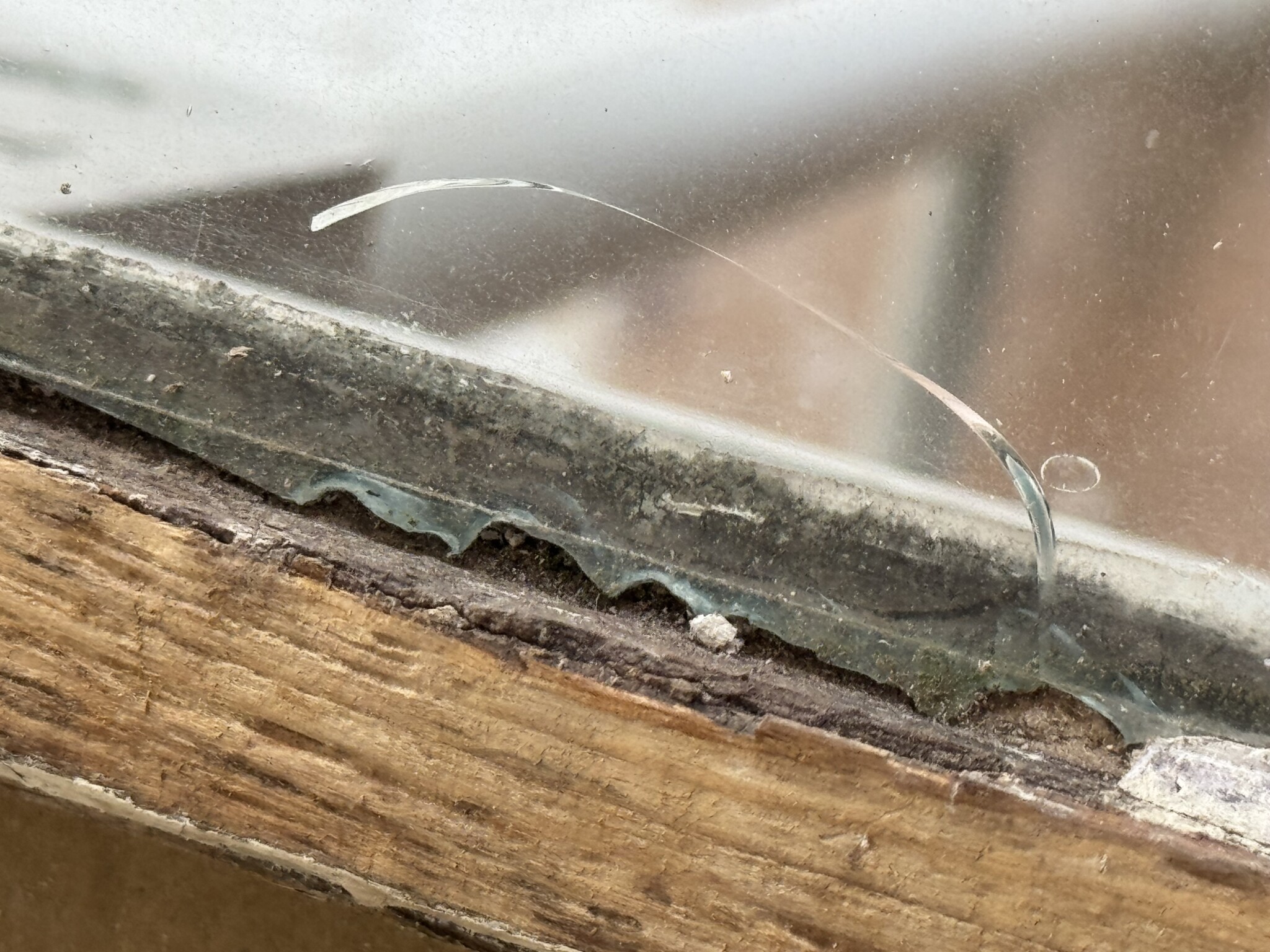 Svårt att rädda glaset när det ser ut så här under kittet. Man ser ritsen men ”glasmästaren” har misslyckats och antagligen brutit bort överskottet med hovtång. Här sprack glaset redan vid försiktig uppvärmning av kittet. Förhoppningsvis begränsad skada så att det går att återanvända till mindre ruta.