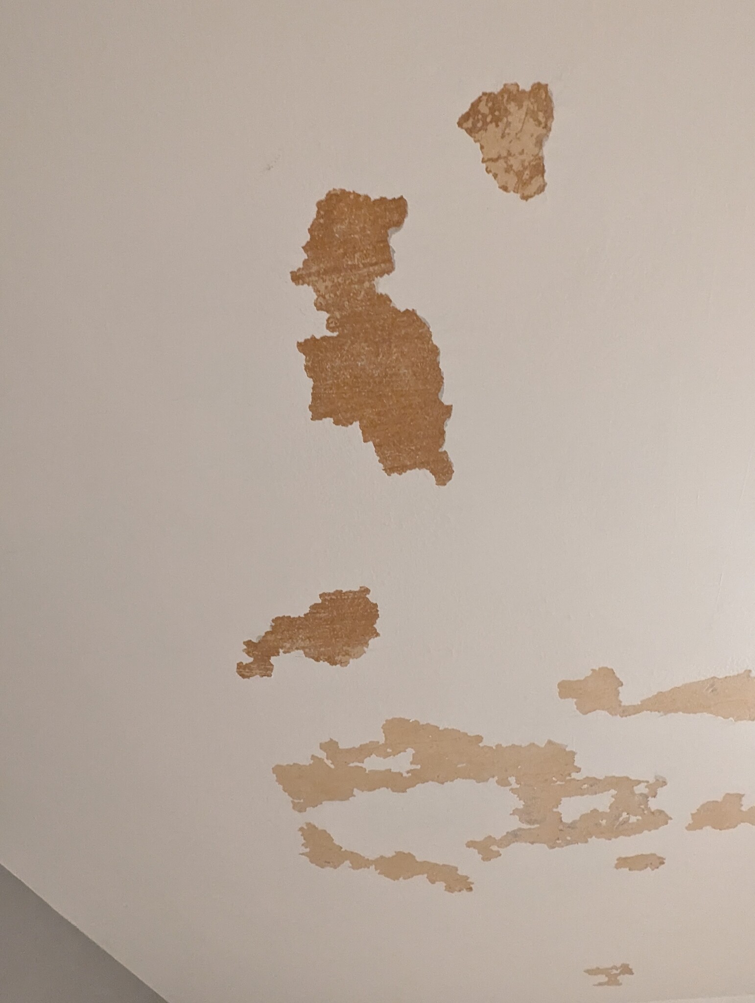Bifogar lite bilder, i första ser man även lite spackel längst upp till vänster, då jag antar att tidigare ägare försökt "lappa" taket. Samt lite fläckar i den gula färgen, där jag kommit ner till det porösa under.