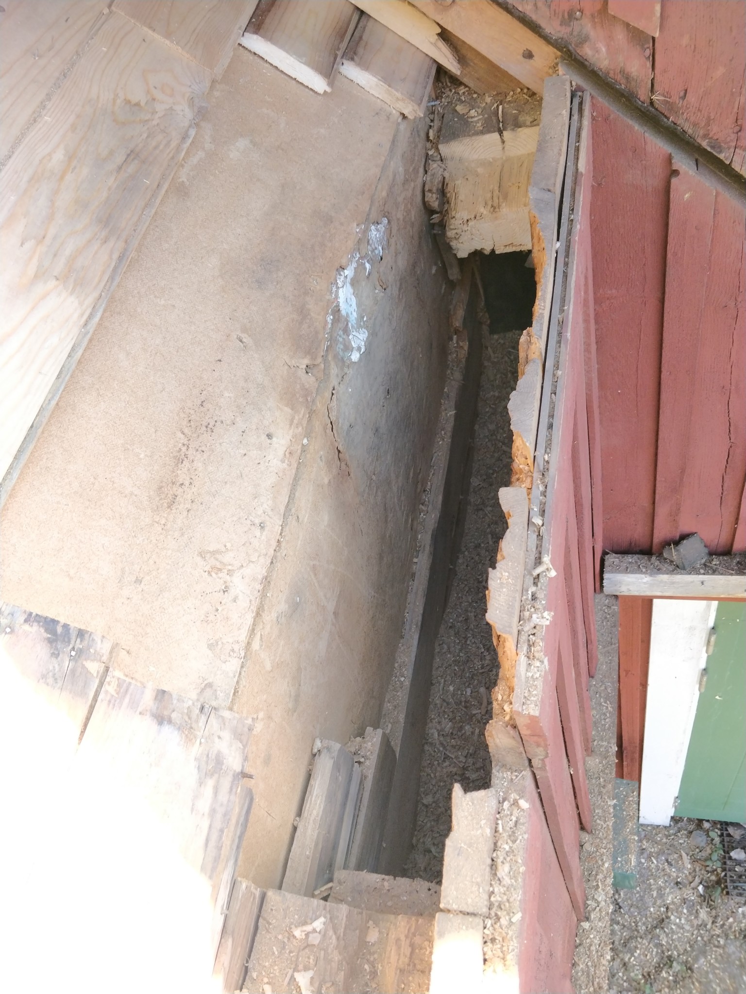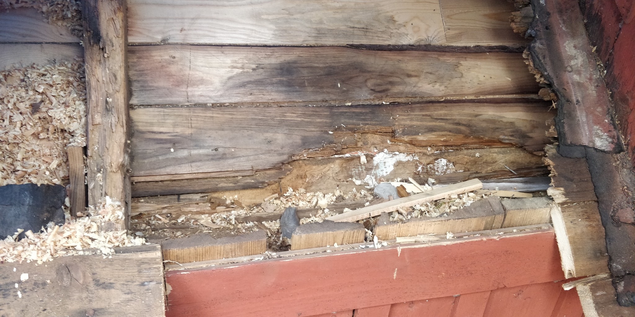 Anledningen till att det kommit in vatten här är att hängrännorna från farstun lett in regnvatten tillbaks in på huset. Kanske inte världens bästa konstruktion.