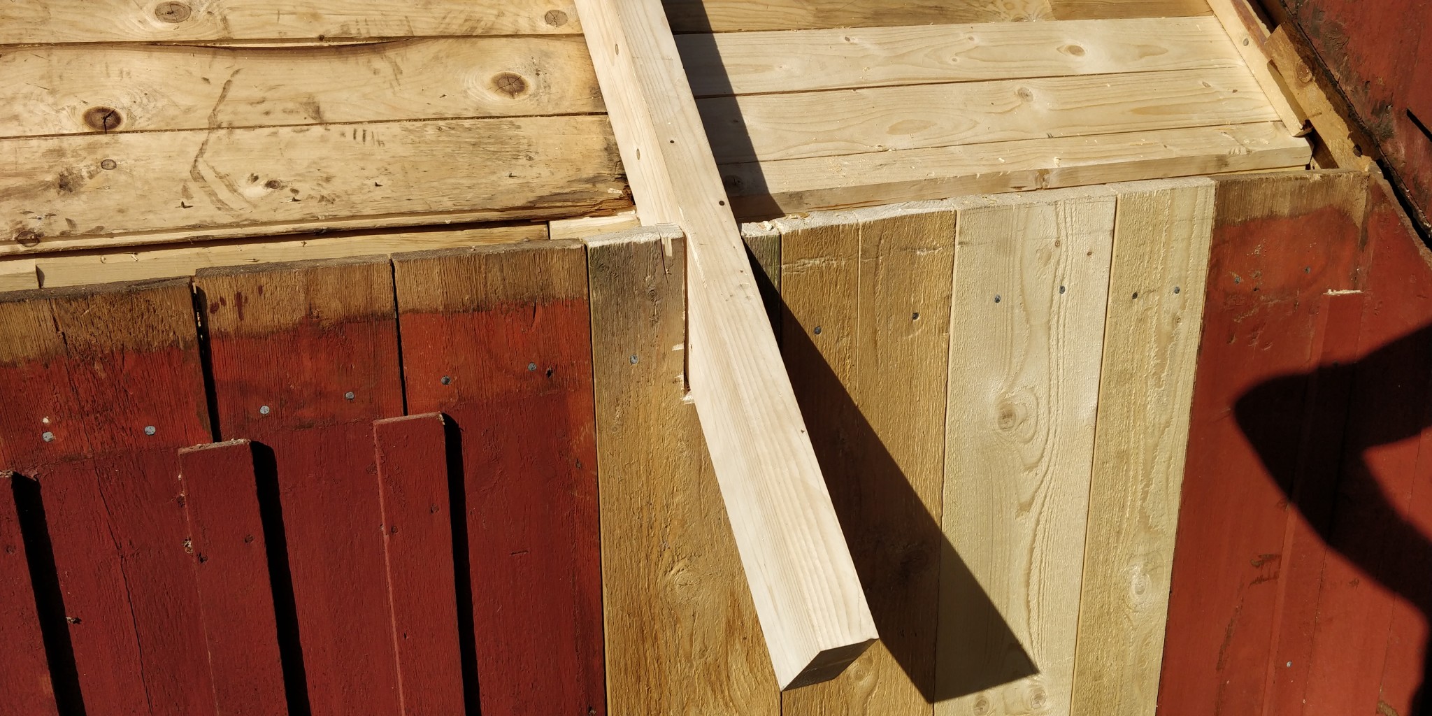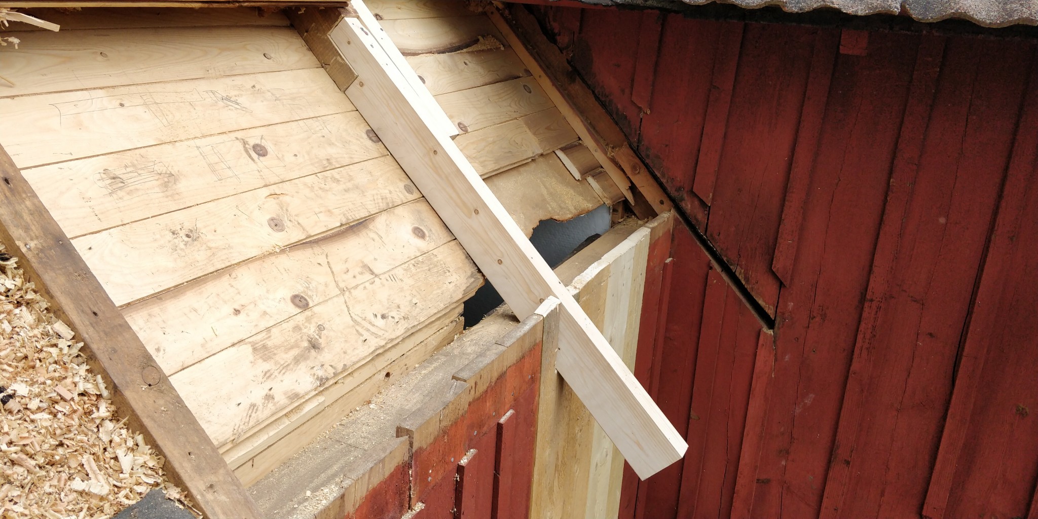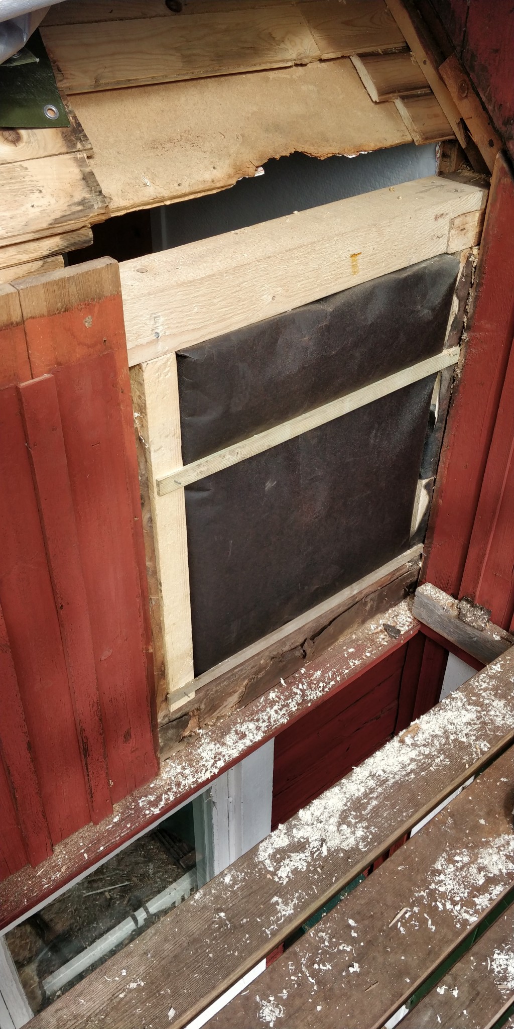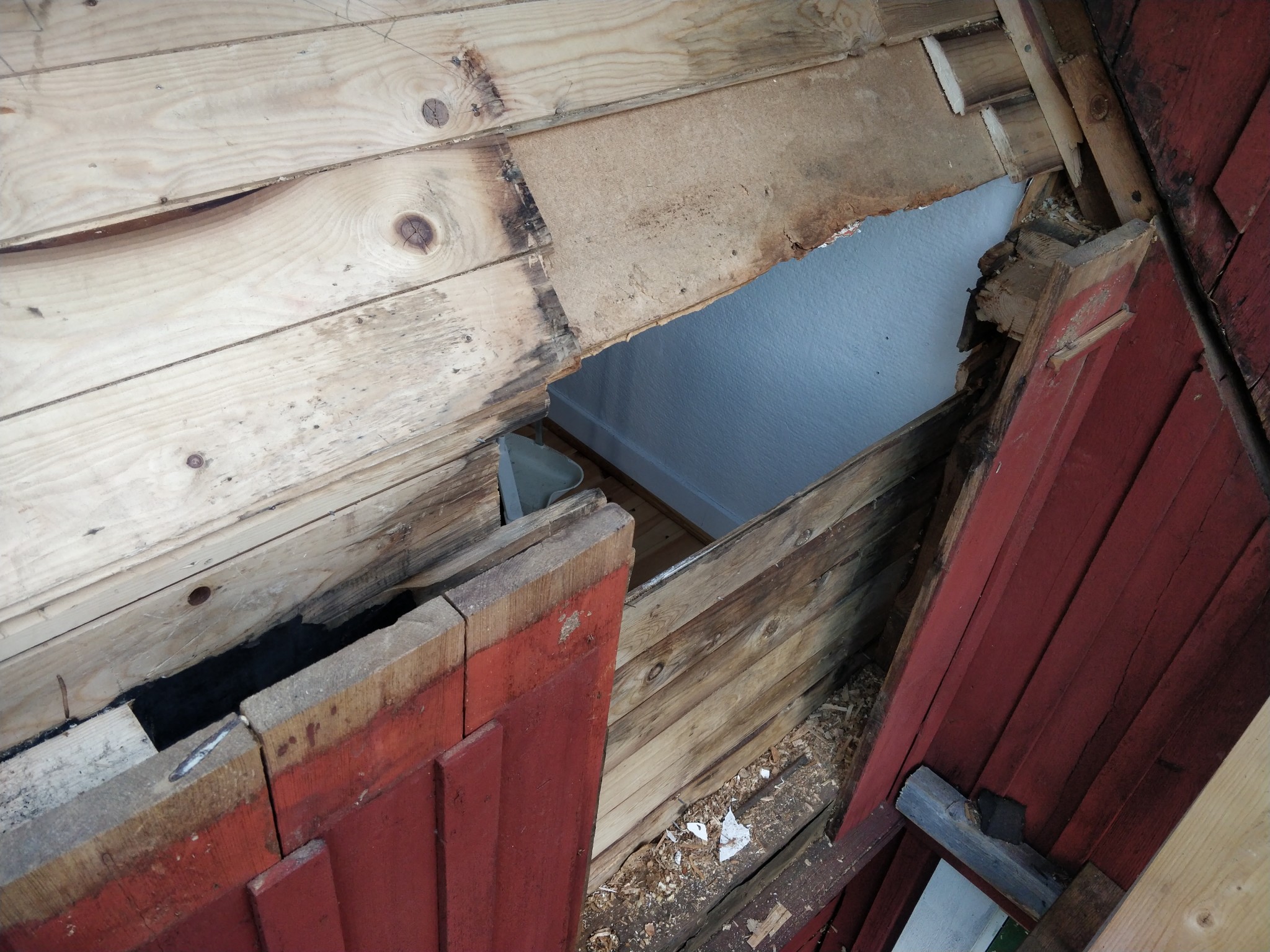 De ruttna delarna byttes, nytt, fint tak på kupan. Lite nytt kutterspån istället för den halva säck som var dålig och så upp med nya plank i innertaket. Det var varken svårt eller särskilt dyrt.