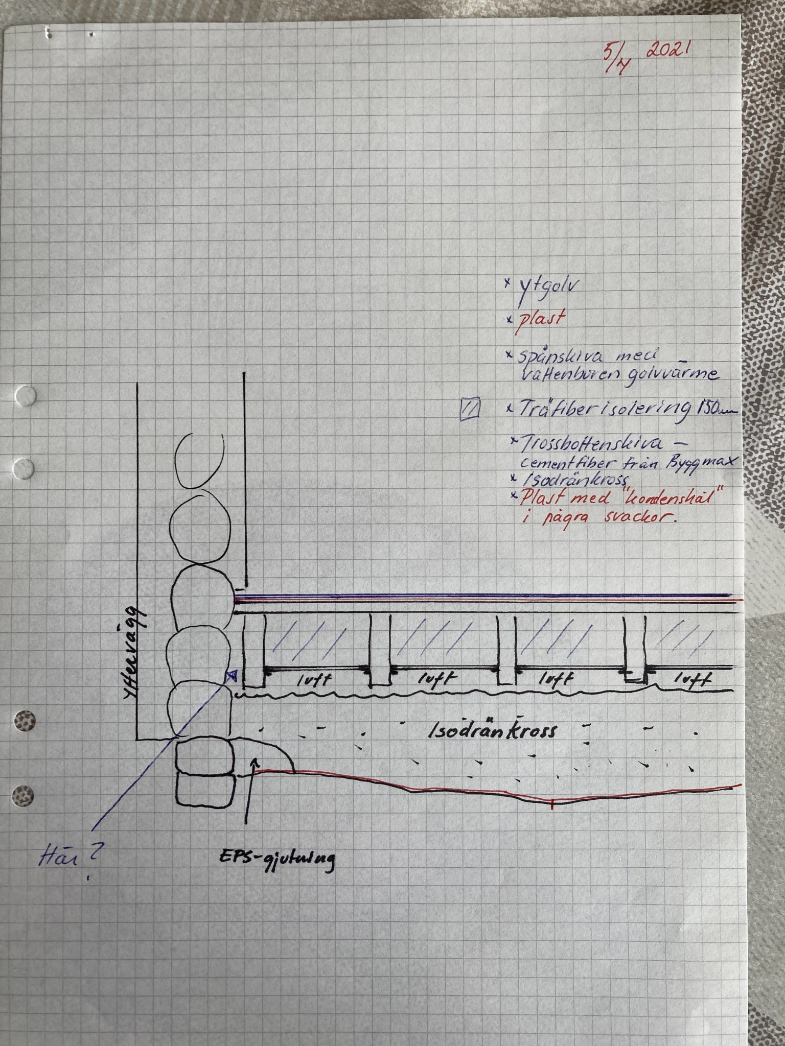 Är det någon som har erfarenhet av Isodrän varmgrund i torpargrund? Vi har tagit bort allt ner till backen och stängt ventilerna. Tänker lägga ut åldersbeständigplast med några ” kondenshål” sen isodränkross till under bjälklag. Utrymmet varierar i höjd mellan mark och bjälkar, från 15-30 cm. Stengrunden är ca 10 cm hög och den har vi murat/tätat med epscement. Ovanför är det någon stock och sen bjälklag. Bjälkarna är 2200 mm så vi sätter upp lister och Byggmax cementfibertrosskiva så det passar med 150 träfiberisolering ovanför. Då bildas det ett luftutrymme på ca 80 under. På bjälkarna blir det spårad spånplatta med vattenburen golvvärme. Plast och laminatgolv.