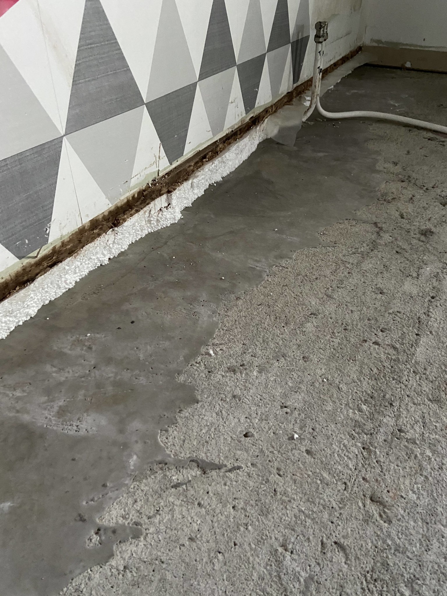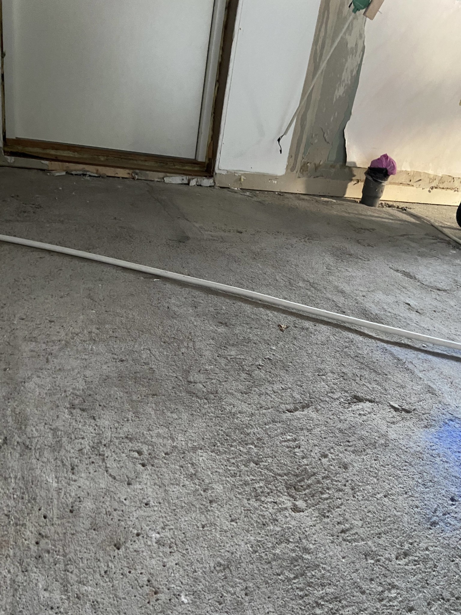 Oisolerad platta på mark med flytande golv. Har nu rivit bort allt ända ner på plattan. Ska bila och flytta lite avlopp för att sedan lägga nytt flytande golv med exakt samma princip. Cellplast och golvspånskivor.