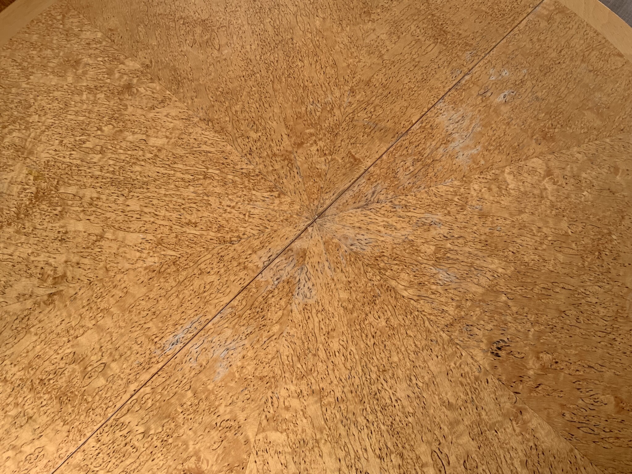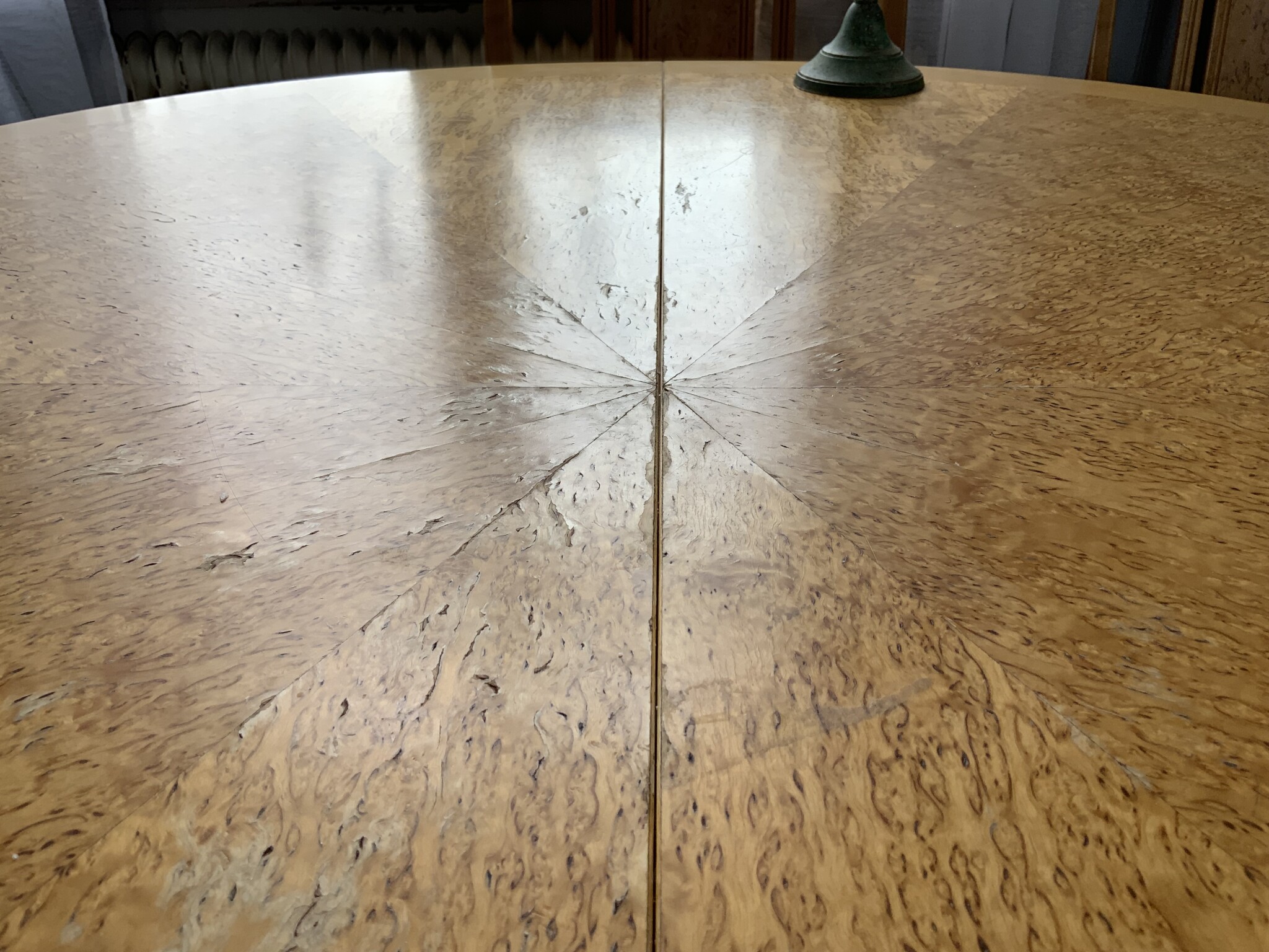 Har fått tag i detta fina bord med faner av masurbjörk. Dock har lacken släppt på sina ställen och det ser ut som att faneren har rest sig lite, samt att träet har grånat fläckvis