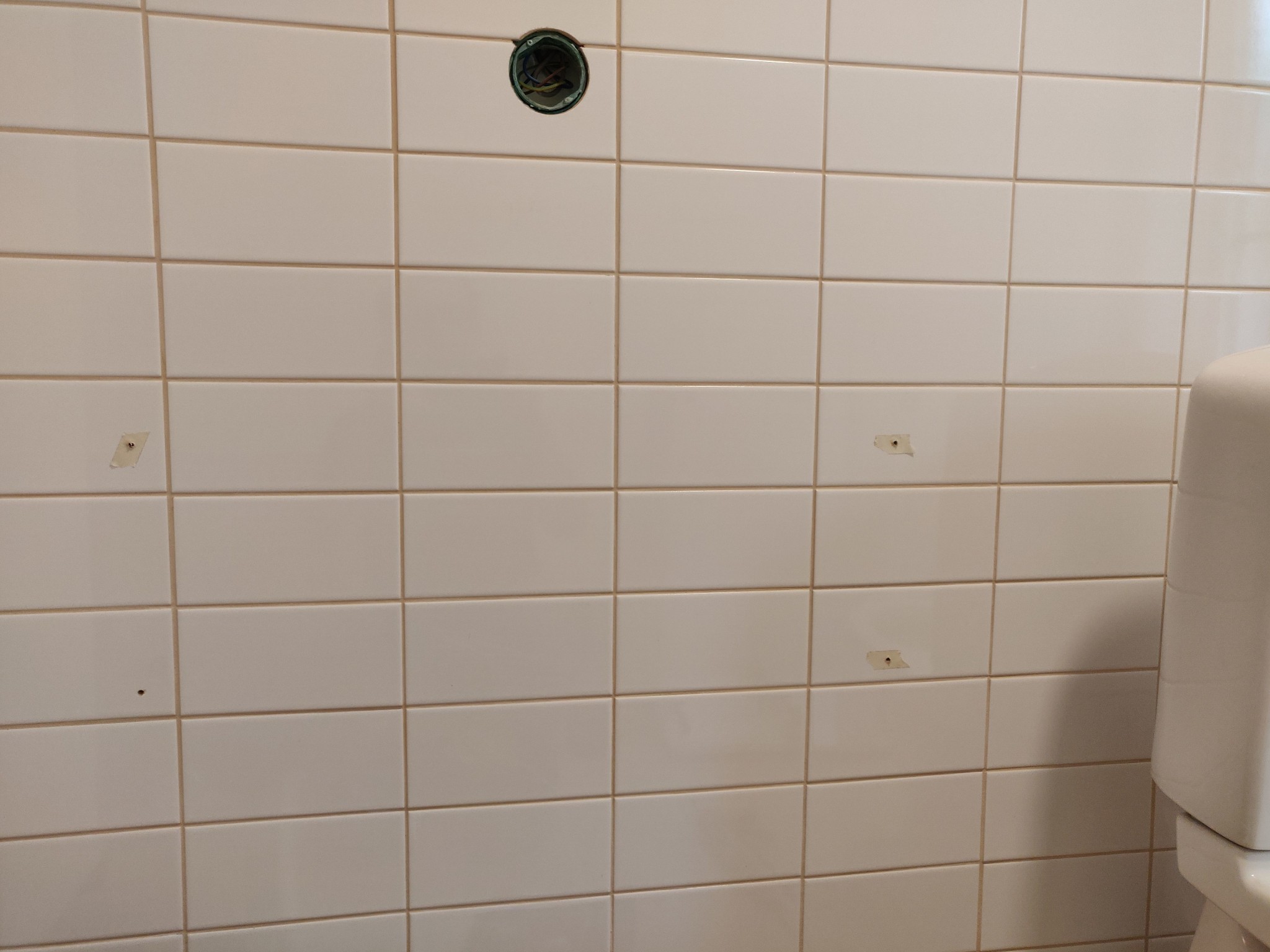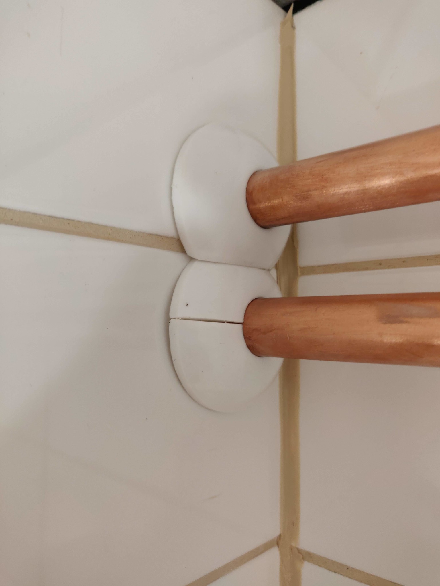 Köpte nya täckbrickor i plast till rören i väggen men då dessa är ca 55 mm i diameter och rören sitter med cc 40 så överlappar dessa varandra. Detta löste jag genom att helt sonika klippa bort en del av täckbrickorna, 7.5mm per bricka för att vara exakt. Gamla täckbrickorna och även rörhållarna var på tok för stora och gjorda för helt andra rördimensioner, vet inte hur dom tänkte där.