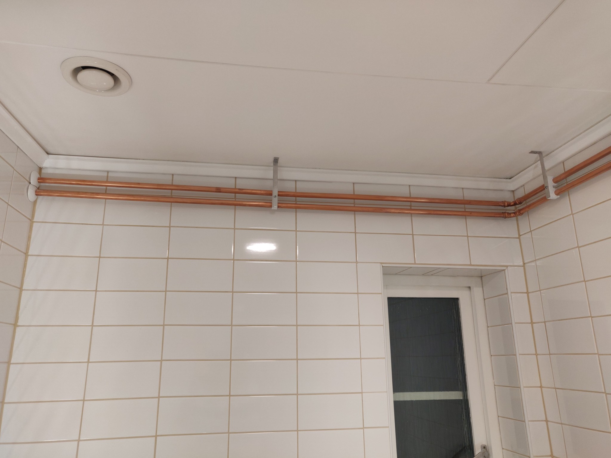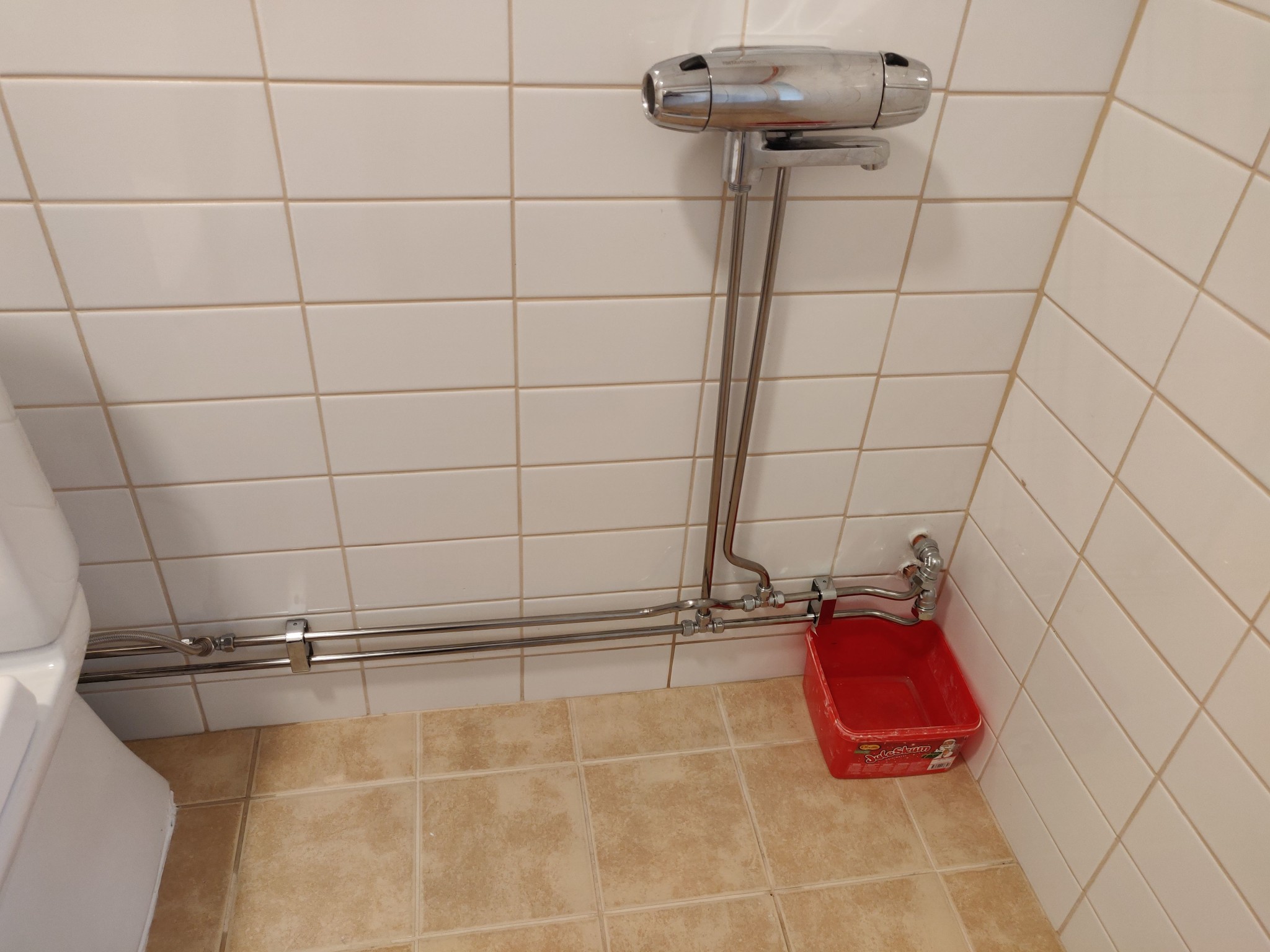 En vattenskada är sen en utopi i detta fall då alla rör och kopplingar är i dagen och såväl vägg som golv har godkänt tätskikt.