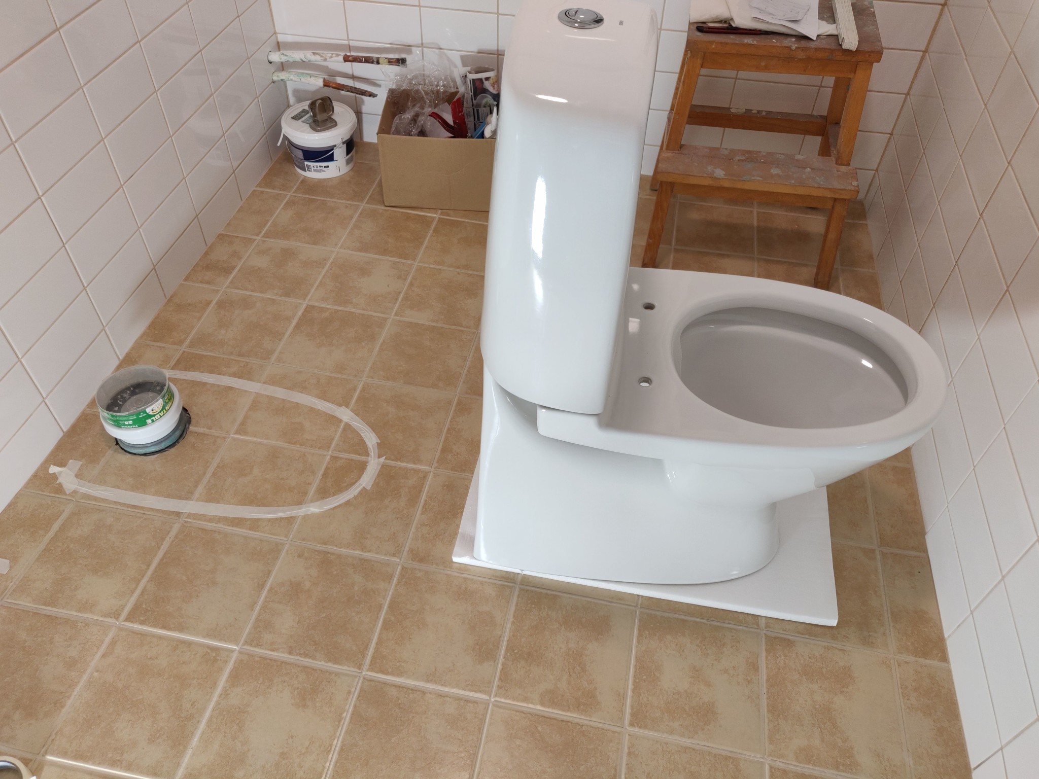 Stolen är väldigt lättmonterad, det medföljer en färdig krage som man trycker ner i avloppet och sen ska stolen bara ställas på plats rakt ovanpå den och det är väl ingen nackdel om man petar dit lite diskmedel först. Inget slabbande med tätningsmassor eller annat som det var för 100 år sen. När stolen väl är på plats sätter man maskeringstejp på golvet någon mm ut. Sen gör man samma sak på själva stolen.