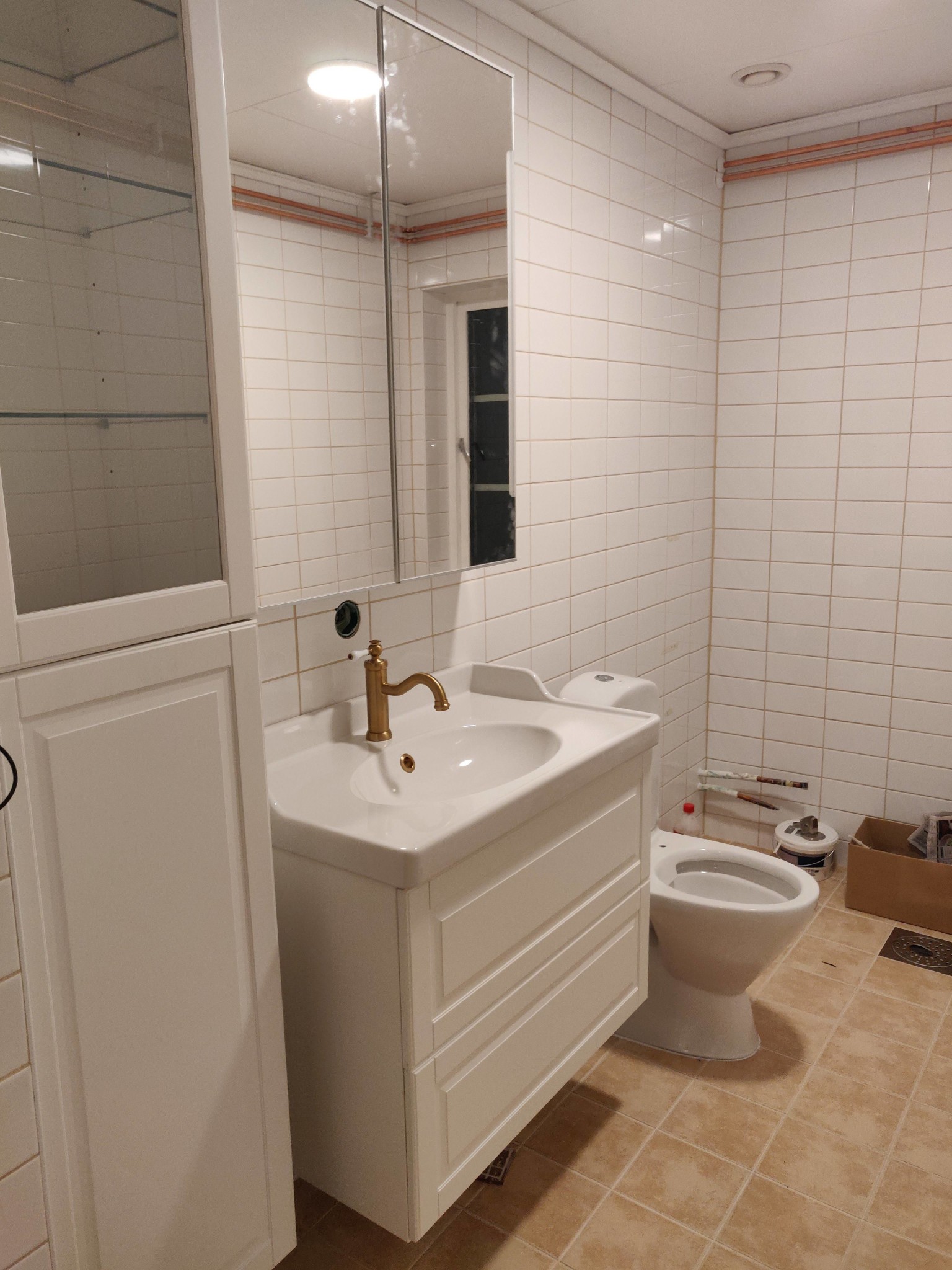Nu börjar det likna nåt! Stol, kommod, spegel, handfat och skåp på plats. Efter mycket dividerande beslöt vi oss för att sätta skåpet kloss mot väggen och kommoden separat. Hopsättningen av allt är på IKEA-vis tidsödande, bitvis otydlig men komplett och bra emballerad. Lite för bra kanske...garaget bågnar nu av wellpapp..