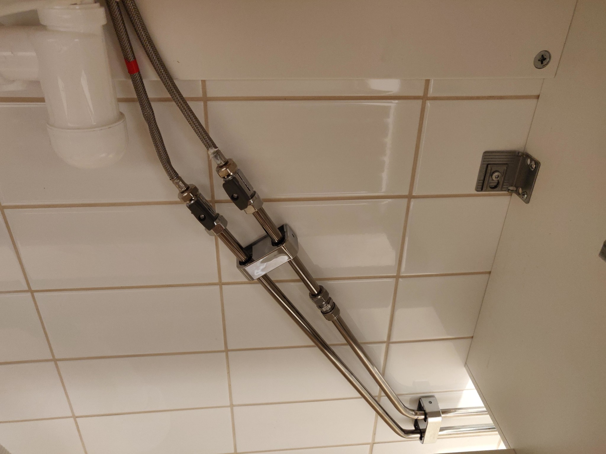 Vi testade att dra hårdare. Och hårdare. Och hårdare. Till slut böjde sig alltihopa och de tidigare så fint parallella rören som gick till båda blandarna försköts flera cm i sidled.