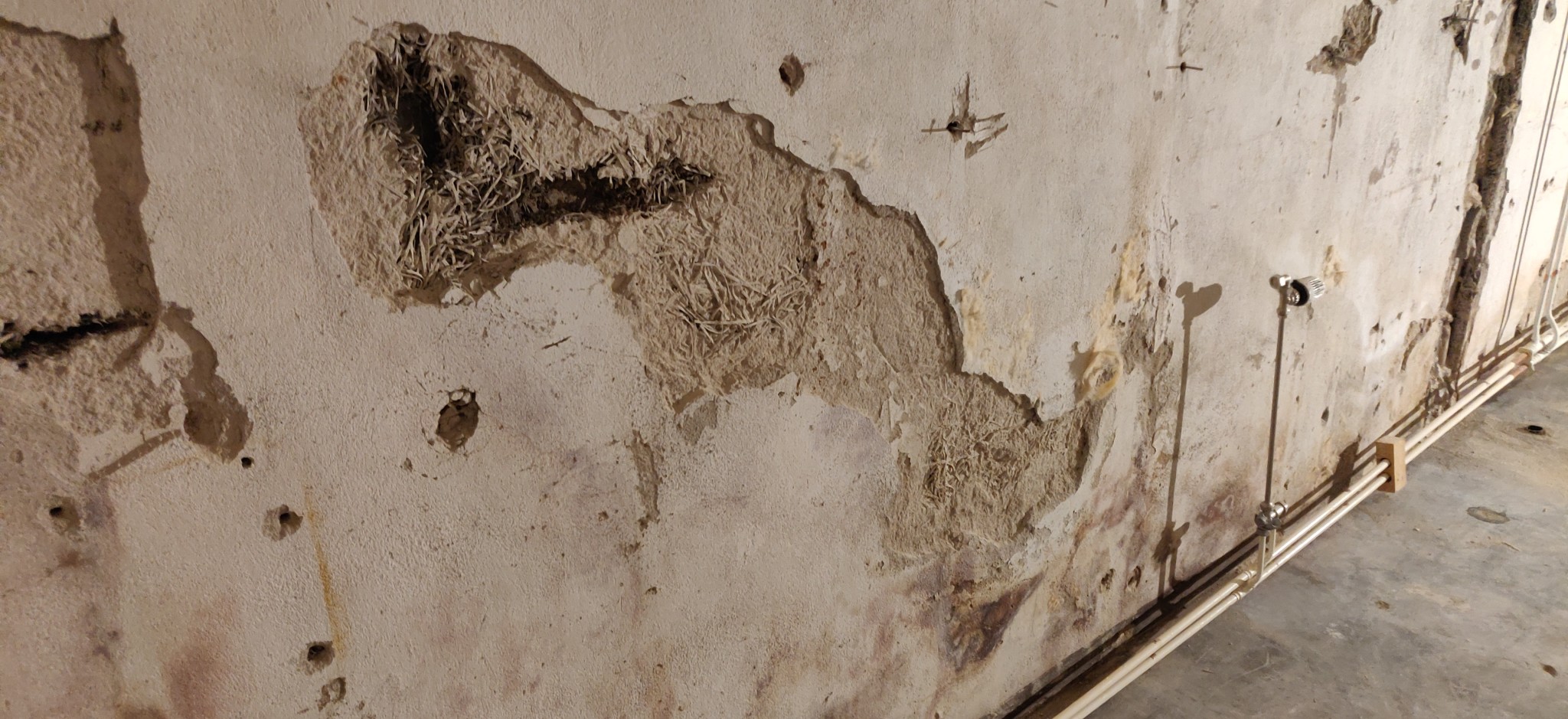 Vi håller på att renovera en källare med fuktproblem. Har rivit ut de reglade väggarna samt tak och golv. I ytterhörnet av rummet syntes tecken av fukt och väggarna där var inte i så bra skick, otroligt porösa. Smular vid minsta beröring. Se bilderna.