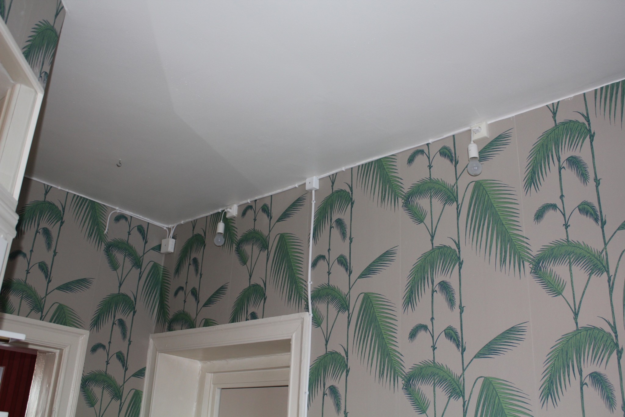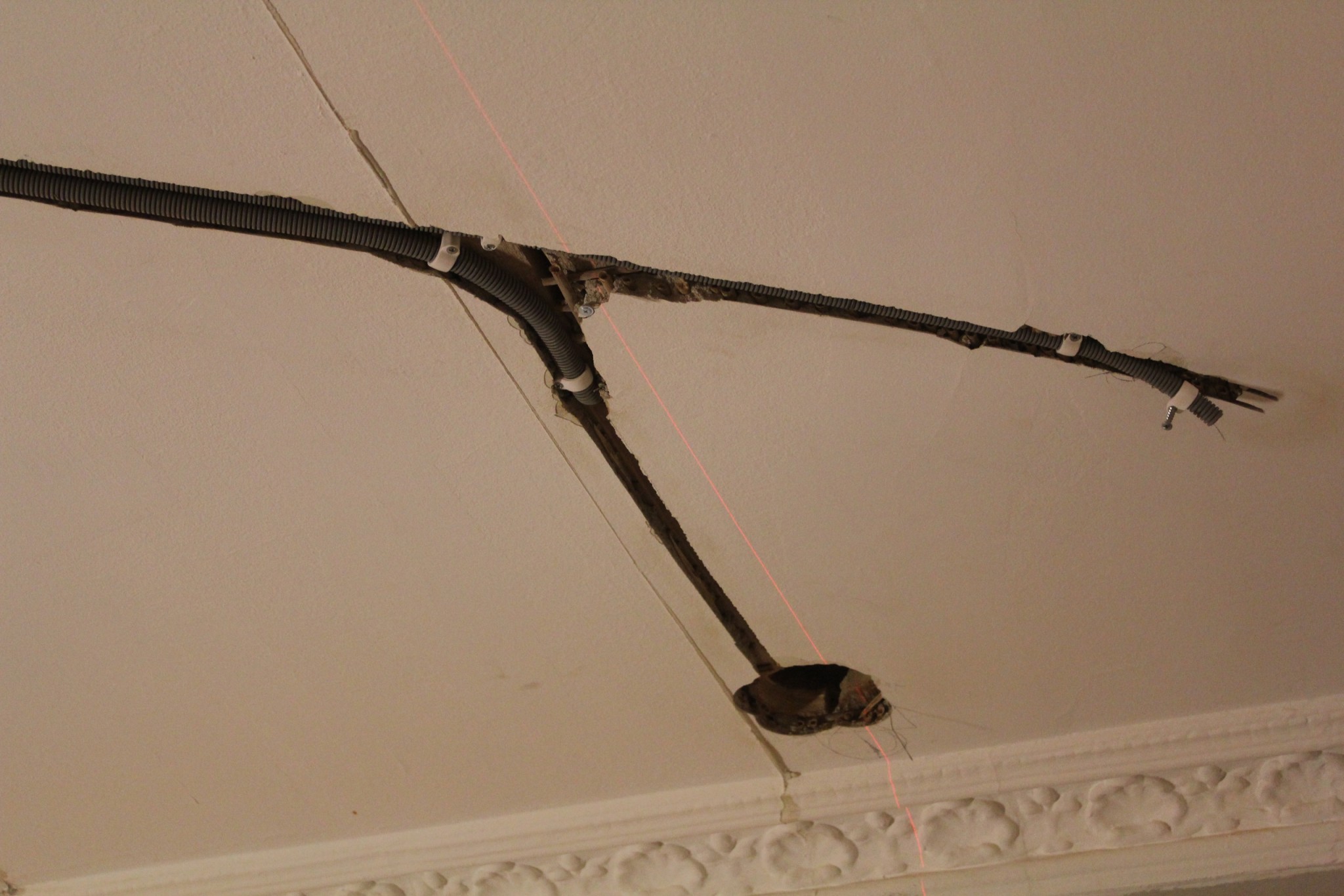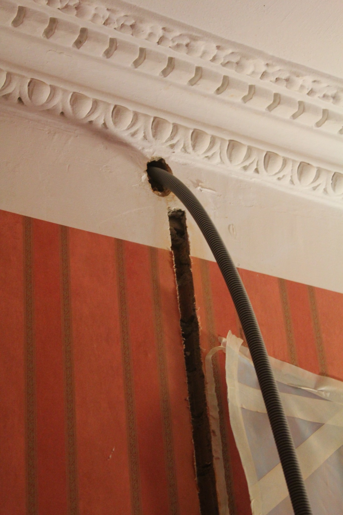 Problemet jag hade var hur jag skulle dra slangen emellan strömbrytaren och takdosan för att slippa förstöra stuckaturen. Det löste jag genom att borra snett upp ifrån ena rummet så jag hamna i taket på det andra rummet, därefter fick jag göra de stora hålen i taket för att kunna komma åt slangen, sedan vidare till takdosan. Bilderna förklarar endel.