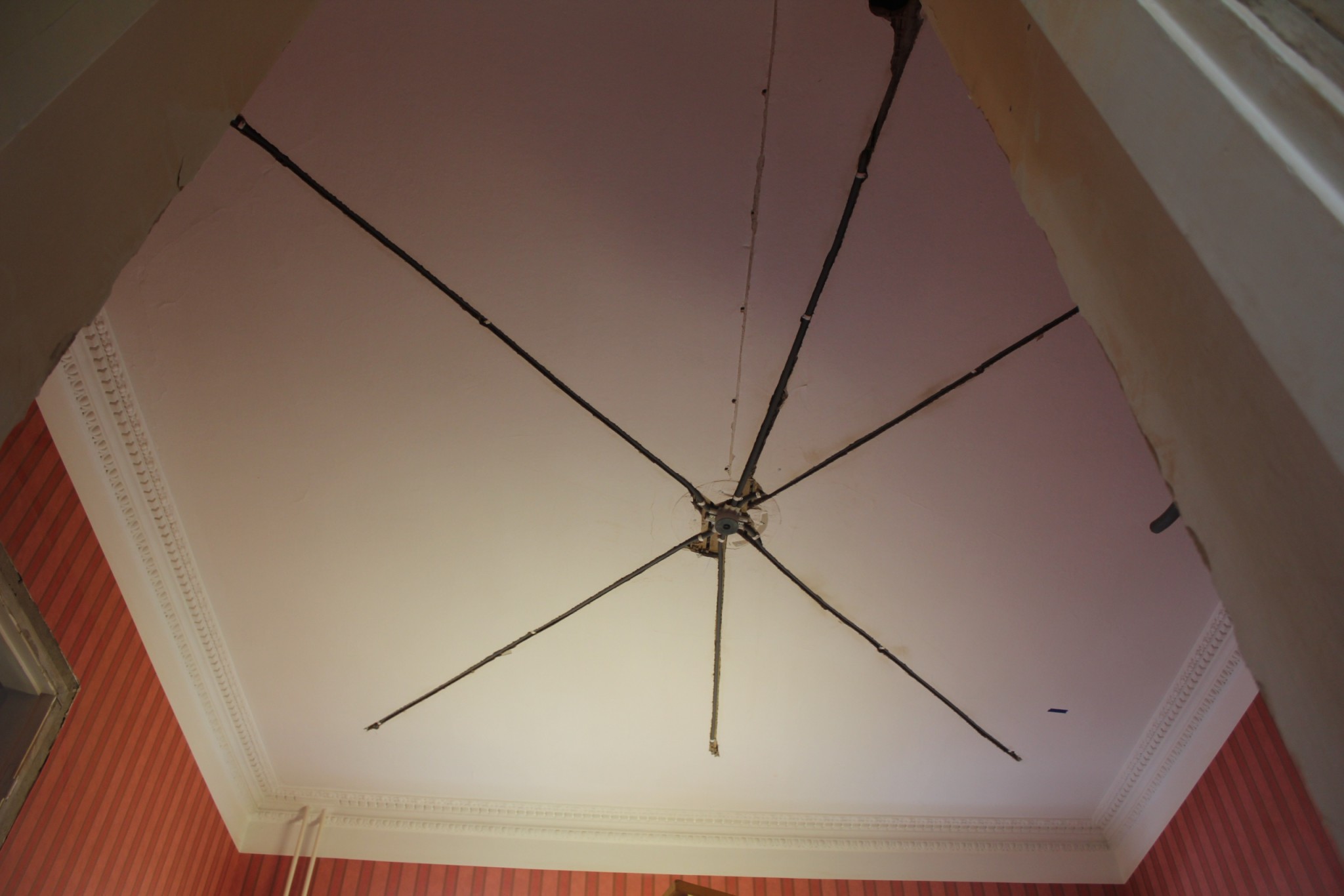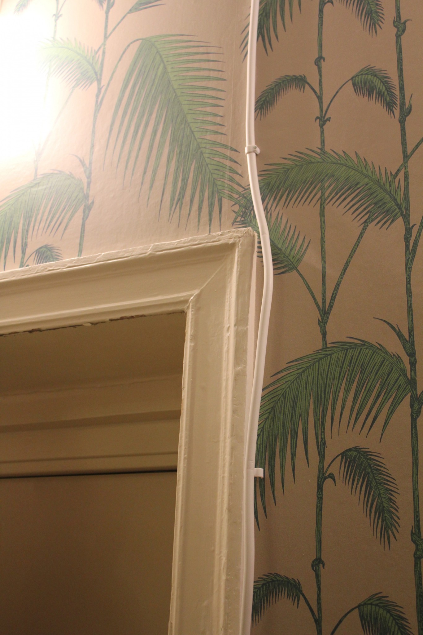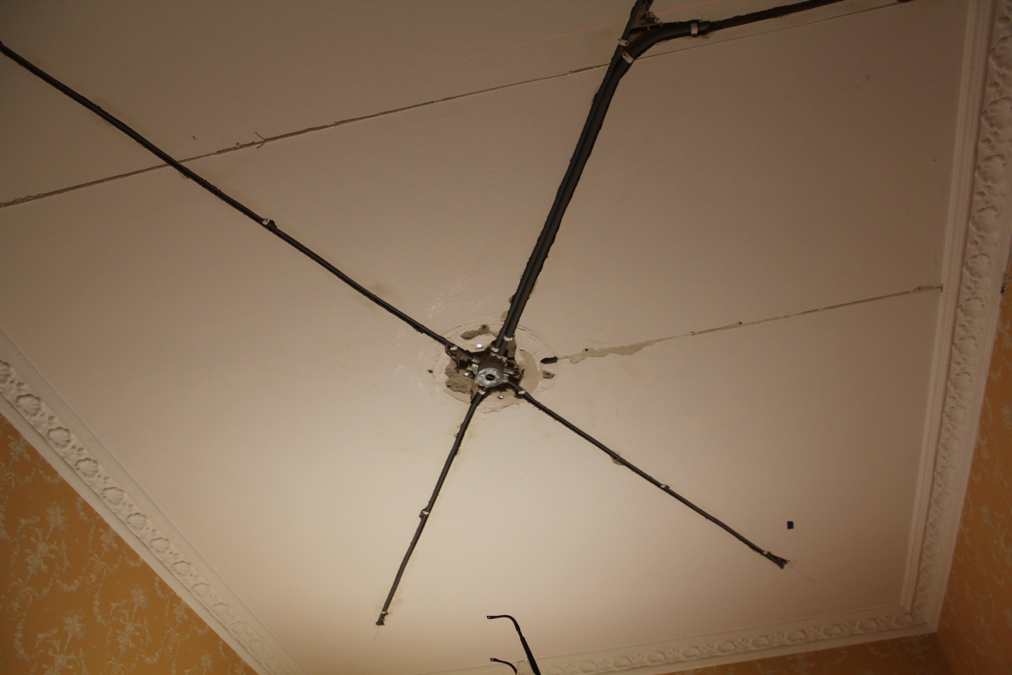 Problemet jag hade var hur jag skulle dra slangen emellan strömbrytaren och takdosan för att slippa förstöra stuckaturen. Det löste jag genom att borra snett upp ifrån ena rummet så jag hamna i taket på det andra rummet, därefter fick jag göra de stora hålen i taket för att kunna komma åt slangen, sedan vidare till takdosan. Bilderna förklarar endel.