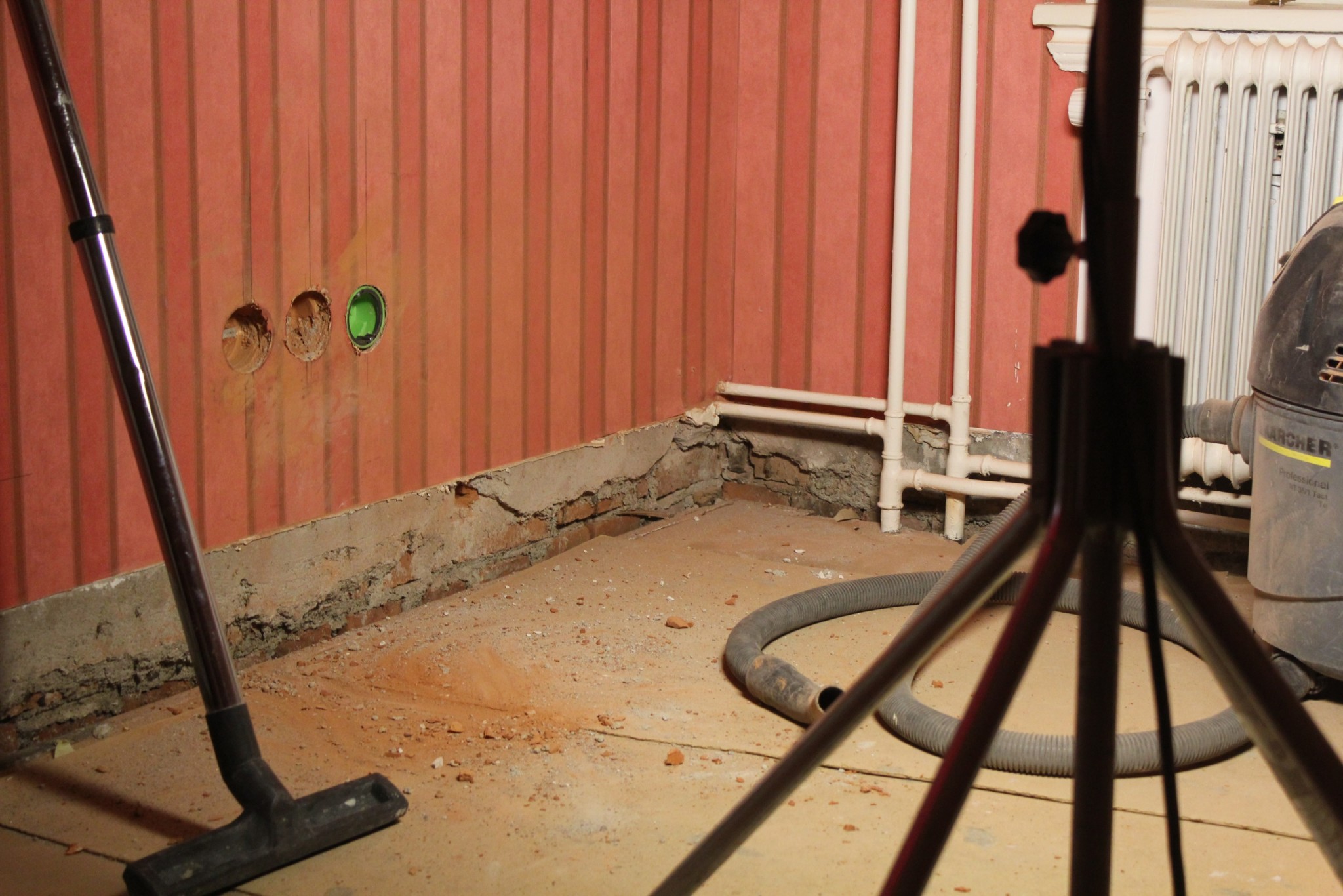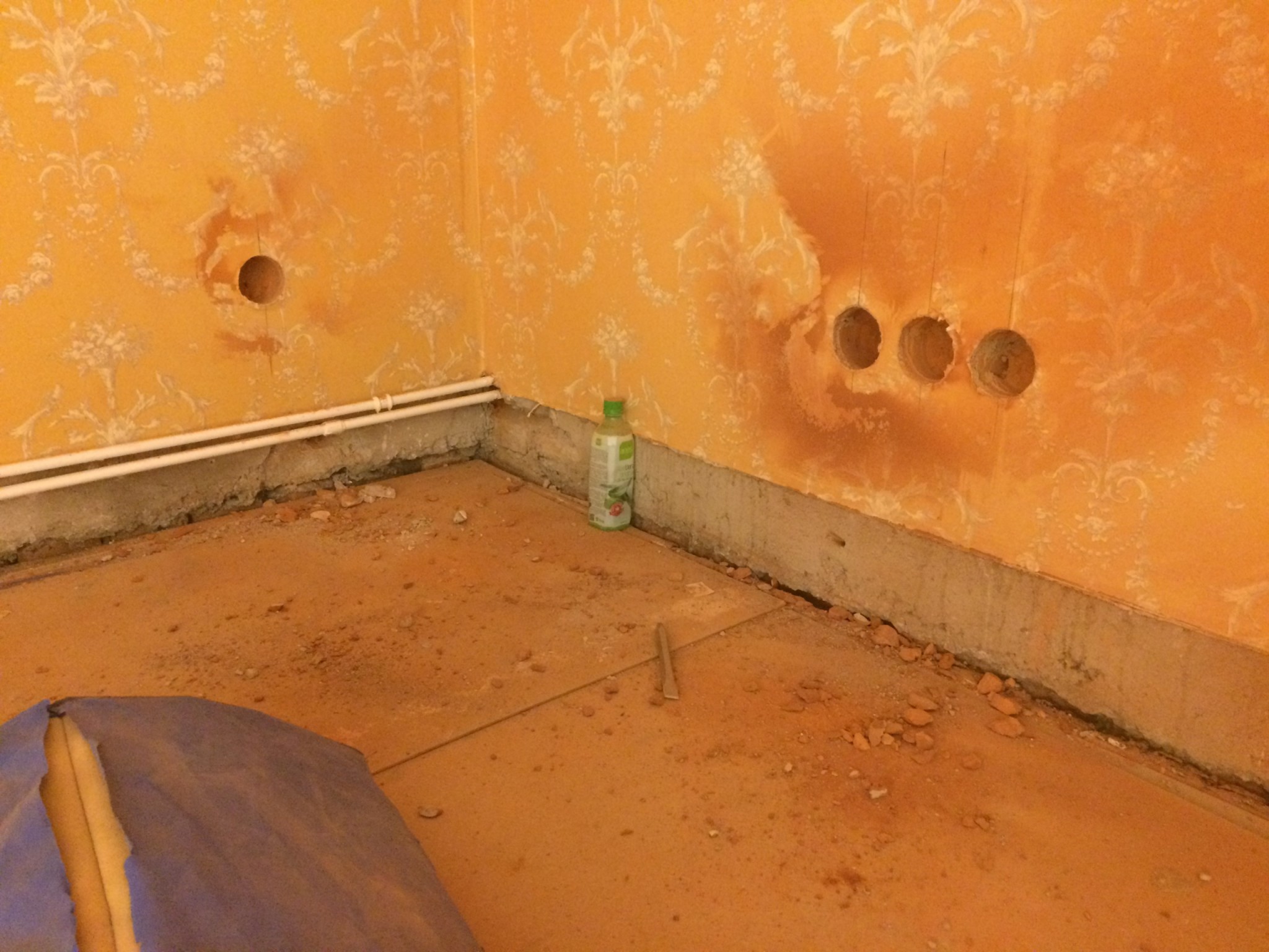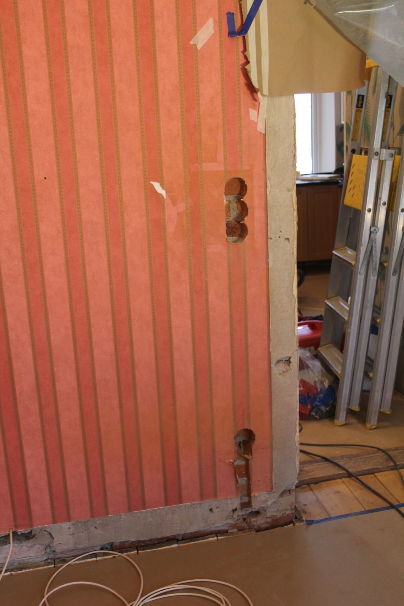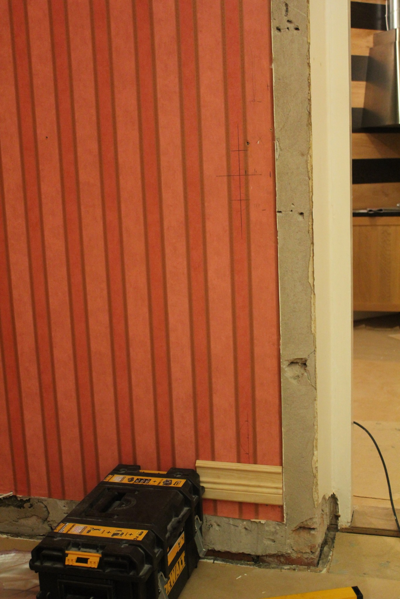 Golvsocklar och dörrfoder plockas ned, markerade även ut vart nya strömbrytare och vägguttag skall placeras.