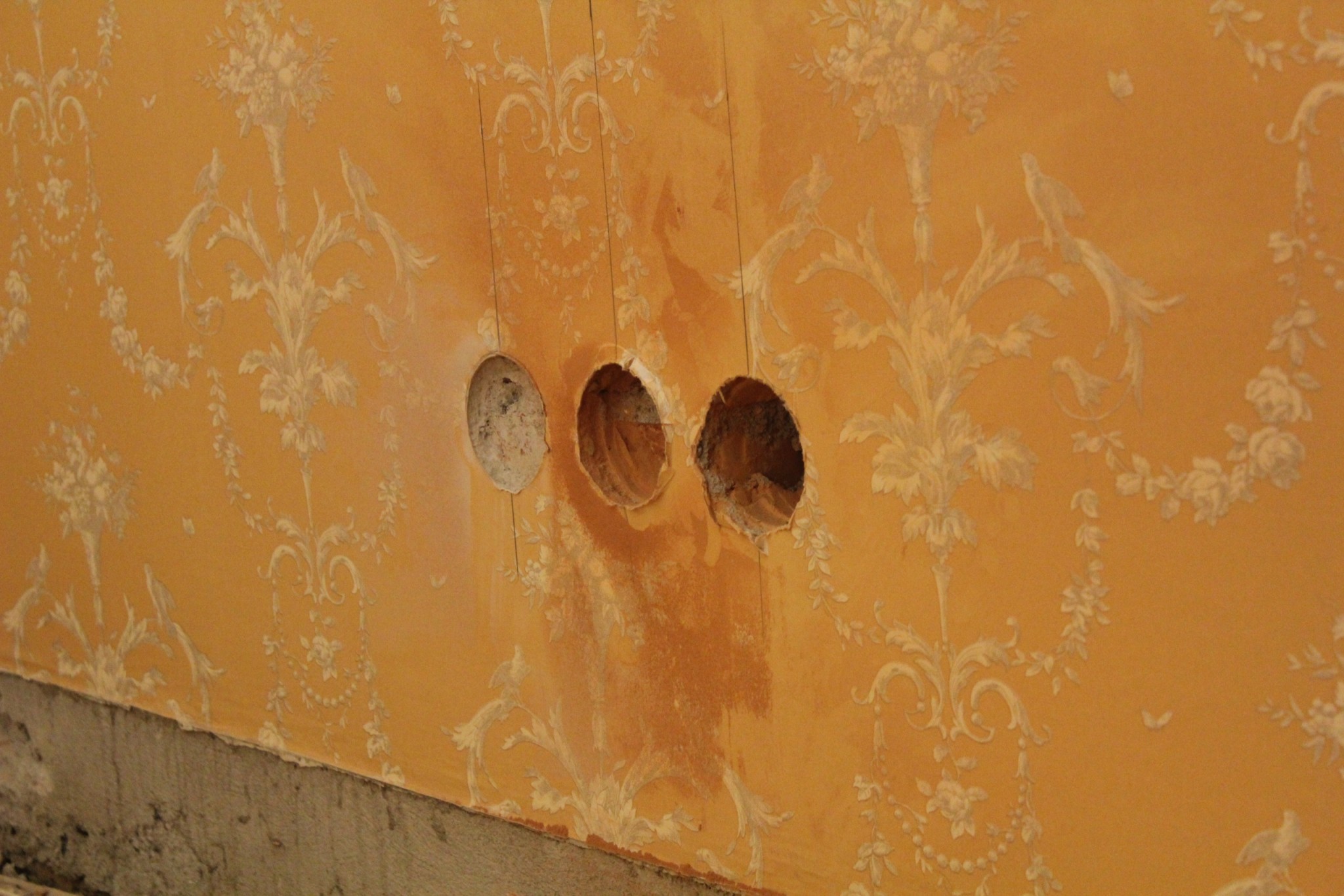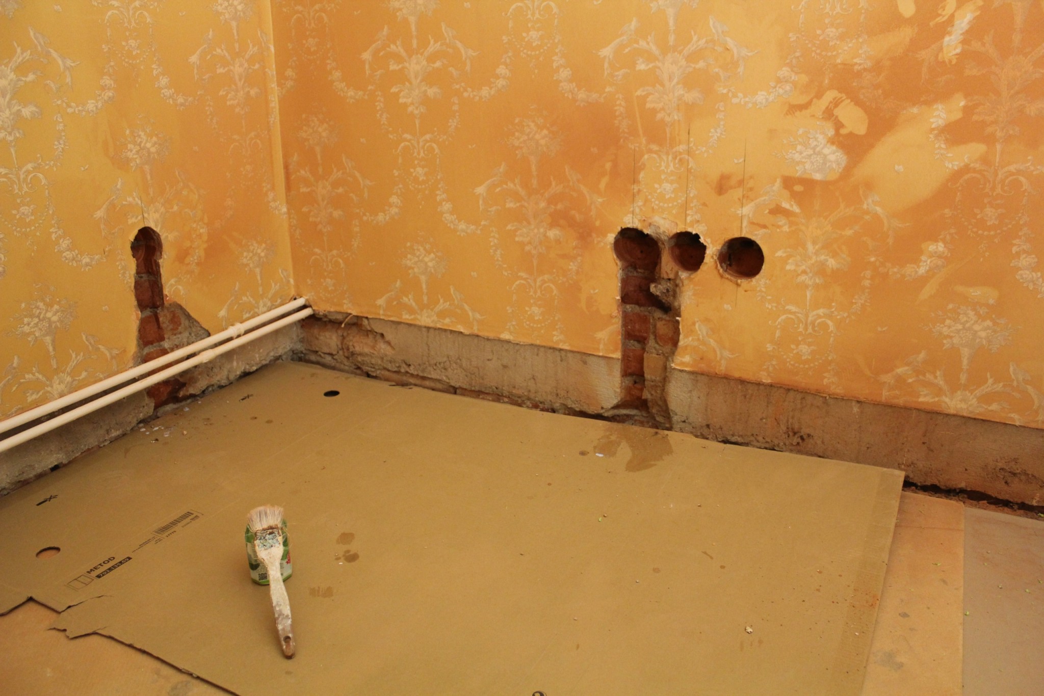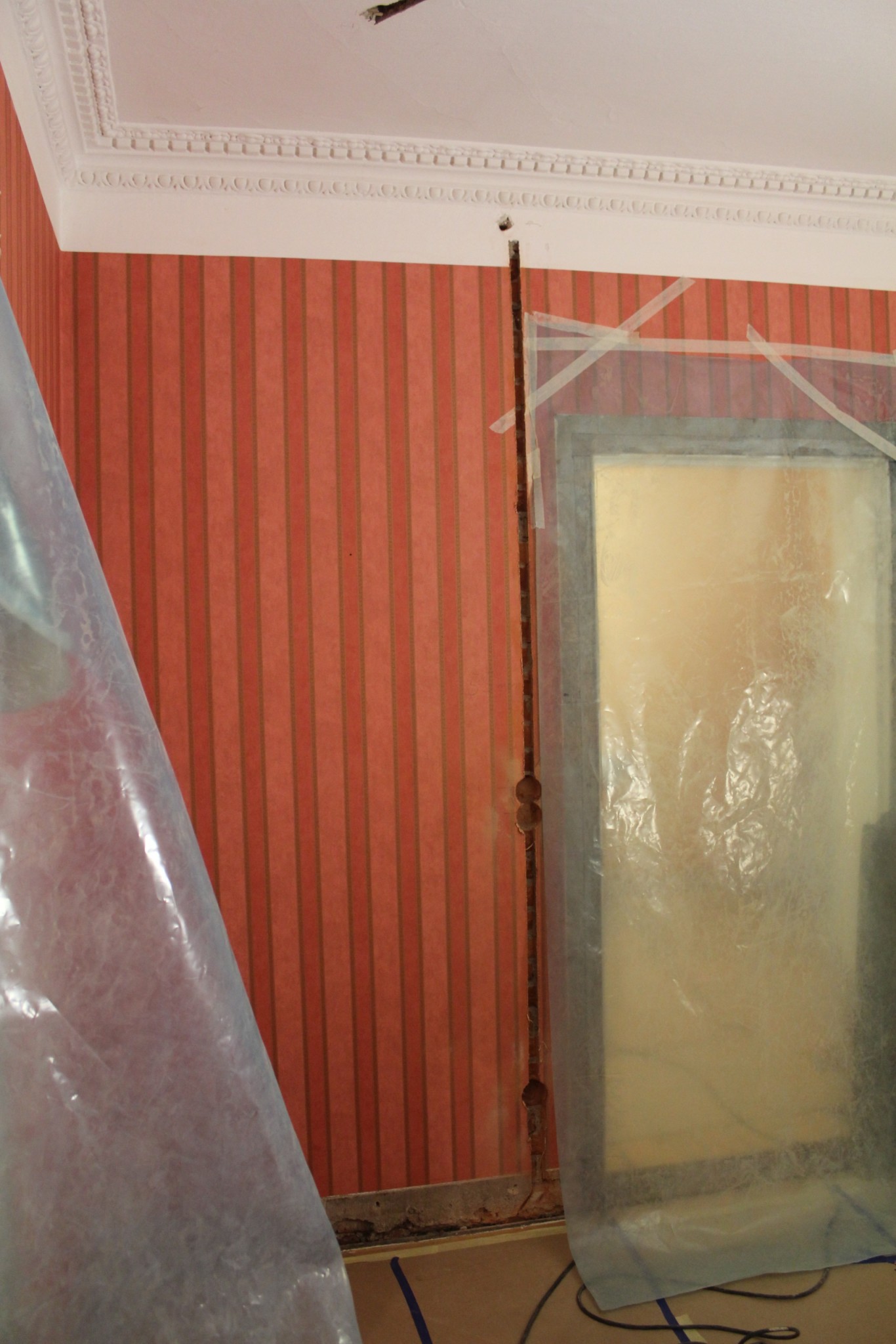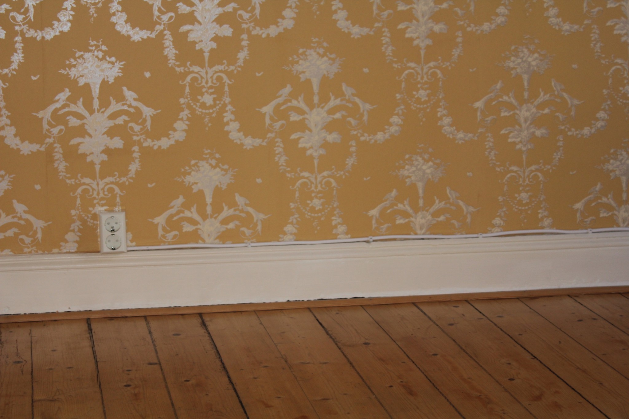 Golvsocklar och dörrfoder plockas ned, markerade även ut vart nya strömbrytare och vägguttag skall placeras.