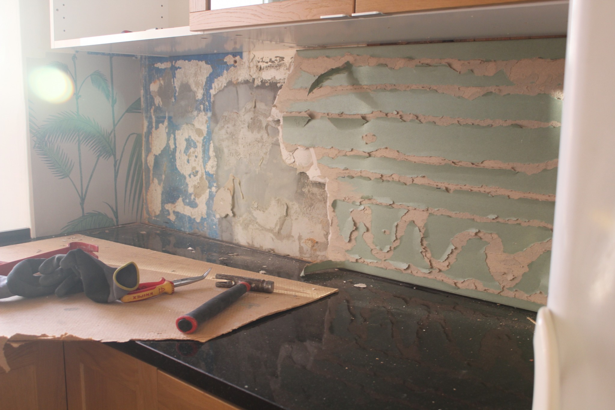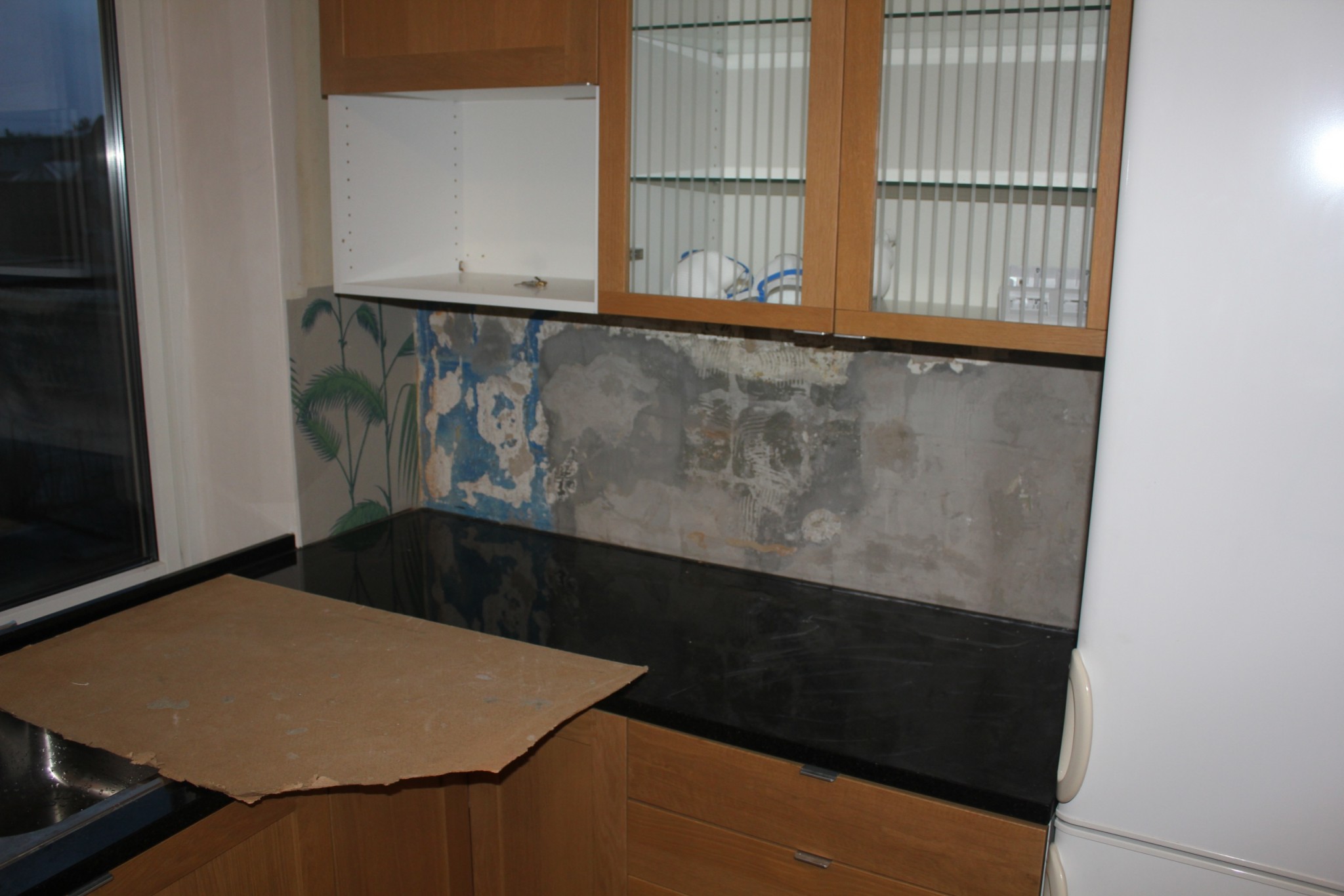 *Ta bort parkettgolv som stänkskydd i kök som ersätts med kakel.