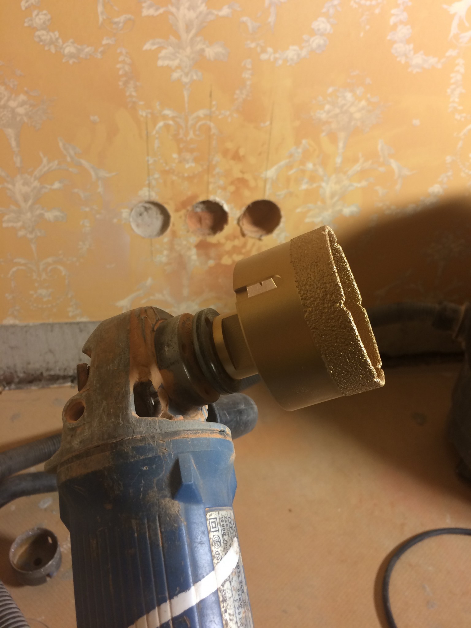 Totalt blev det 27st doshål som jag gjorde med vinkelslip tillsammans med ett dosborr gjort av diamant. Efter det så fräste jag spår ned mot golvet där det finns plats att lägga VP-rör samt flexslang, men tanke på att jag ska ha 29cm höga lister så finns det plats för att gömma el-rören. Där det sitter 3st dosor i följd är tanken el - nätverk - högtalare. Nya bilder kommer snart!